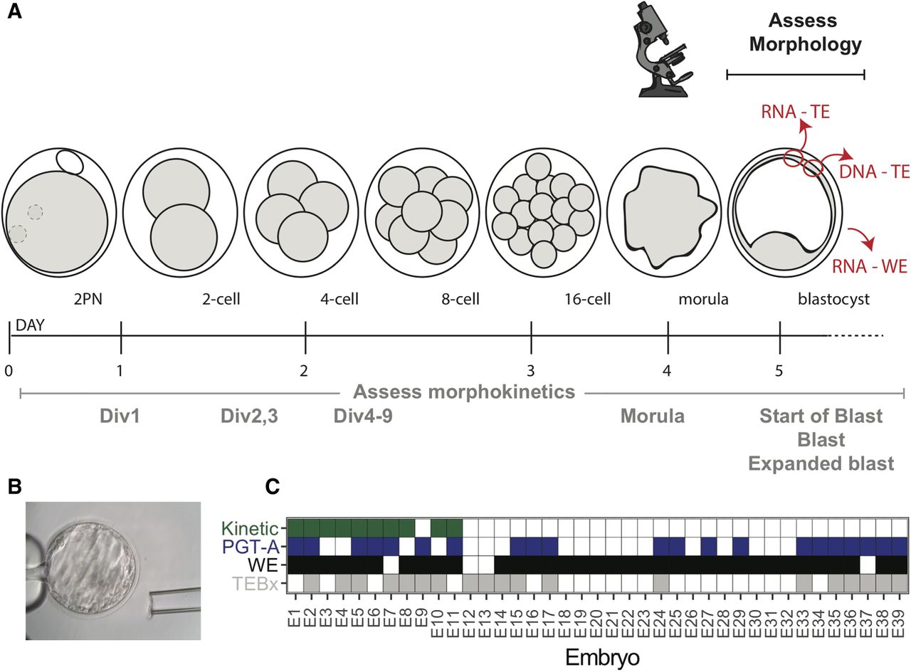 Experimental overview. (A) Preimplantation human development time-course depicting our comparative analytical approach. Samples were processed from blastocyst stage embryos and assessed for morphokinetic criteria and morphology before biopsy. One trophectoderm (TE) biopsy was processed for DNA-based preimplantation genetic testing for aneuploidy (PGT-A), one was harvested for RNA-seq, and the remaining whole embryo (WE) was also processed for RNA-seq. (B) Representative image of a blastocyst. (C) Data overview table. Embryos (E1-39) for which we have morphokinetic data are shaded in green; those for which DNA-based PGT-A yielded a result are depicted in blue; and those for which we have RNA-seq of either WE or TE biopsy are labeled in black and gray, respectively.
