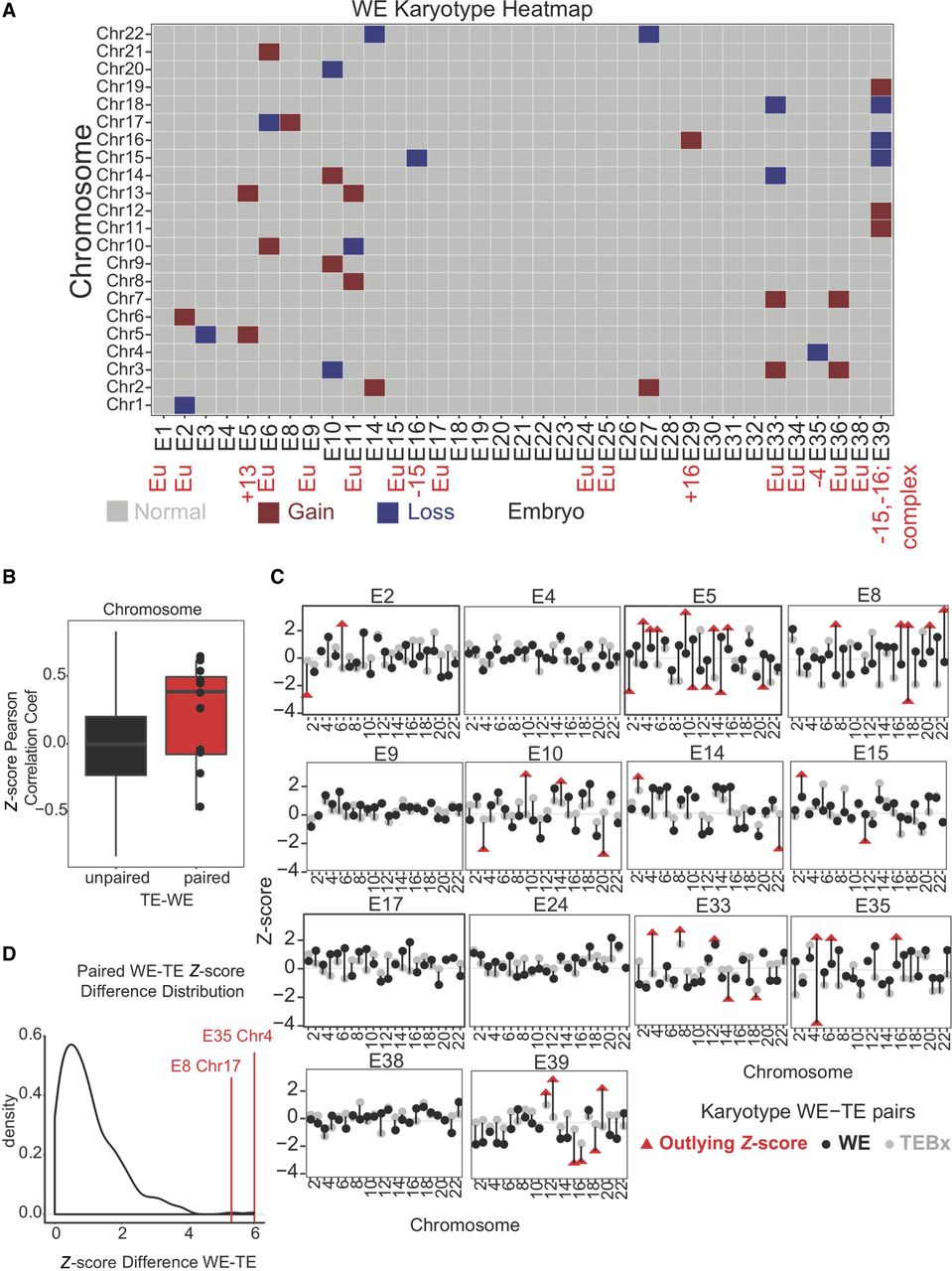 RNA-based digital karyotype. (A) Overview of WE digital karyotypes. Embryos are on the x-axis and chromosomes are on the y-axis. Gray indicates Z-score within the normal range (±2); red, a gain (>2 Z-score); and blue, a chromosomal loss (<−2 Z-score). Red text indicates results of DNA-based PGT-A where applicable. (B) Boxplot of Pearson correlation coefficients comparing Z-score profiles from unpaired (black; from different embryos) or paired (red; from the same embryo) WE and TE samples. (C) Z-score profiles for paired WE and TE biopsy samples. Black dot indicates Z-score (y-axis) of WE; gray dot, Z-score of TE biopsy. Red triangles indicate outlying Z-scores. Chromosomes indicated along the x-axis. (D) Distribution of Z-score differences between WE and TE biopsy for paired samples (originating from the same embryo). Red lines indicate E8 Chromosome 17 and E35 Chromosome 4 as outliers.