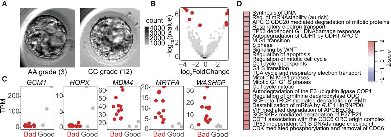 Morphology-associated gene sets. (A) Representative good morphological quality (AA grade on Gardner scale) and bad morphological quality (CC grade on Gardner scale) blastocysts from our cohort. (B) Volcano plot of differentially expressed genes from morphology-based differential expression analysis. Red indicates significant differential expression (BH-adjusted P-value <0.05). (C) Jitter plots of selected significant differentially expressed genes from the morphology-based differential expression analysis (adjusted P-value <0.05). (D) Reactome gene set enrichment analysis of gene expression from morphology-based differential expression analysis. Red indicates increase in gene set expression in “good” samples.
