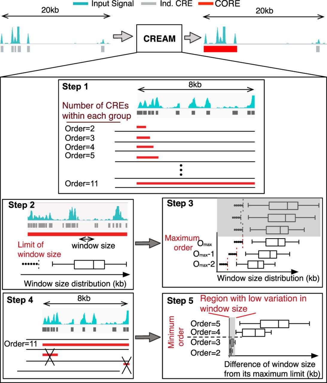 Schematic representation of the five main steps of the clustering of genomic regions analysis method (CREAM). For step 1, CREAM identifies all groups of two, three, four, and more neighboring CREs. The total number of CREs in a group defines its “Order.” Step 2 is identification of the maximum window size (MWS) between two neighboring CREs in group for each Order. The MWS corresponds to the greatest distance allowed between two neighboring CREs in a given cluster. Step 3 is identification of the maximum Order limit of COREs from a given data set. Step 4 is CORE reporting according to the criteria set in step 3 from the highest to the lowest Order. Step 5 is identification of the minimum Order limit of COREs based on the identified COREs in step 4.
