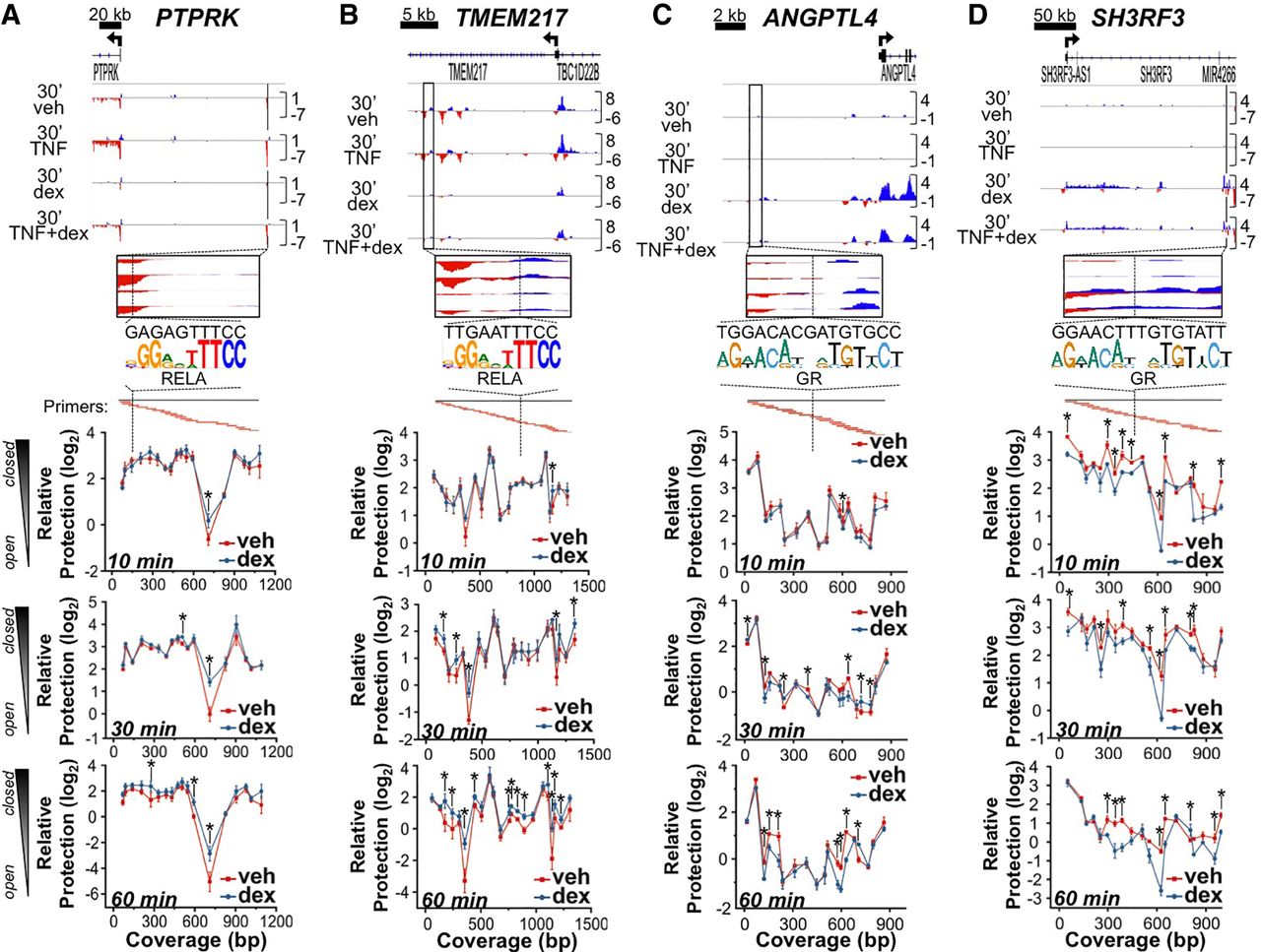 Dex treatment rapidly changes basal chromatin structure of both TNF- and dex-induced enhancers. (A–D, top) IGV screenshots of GRO-seq data with solid black lines/rectangles showing specific TNF-induced (A,B) and dex-induced (C,D) enhancer regions that were interrogated by the MNase assay. Below each screenshot is a zoomed-in view of each assayed region, including the location (dotted black line) and sequence of the strongest match to the NFKB(1,2)/RELA consensus binding motif (A,B) and GR binding motif (C,D). Beneath the binding site matches are the locations of overlapping tiled qPCR primers (amplicons in red) that span each region and correspond to the data points in the line graphs below. (A–D, bottom) Mean relative protection (±SD) against MNase cleavage of each target region as measured by qPCR in BEAS-2B cells treated with veh or dex for 10, 30, or 60 min. (*) P < 0.05 versus veh with Bonferroni correction. Greater protection indicates less accessibility or a more closed chromatin structure, as illustrated on the far left.