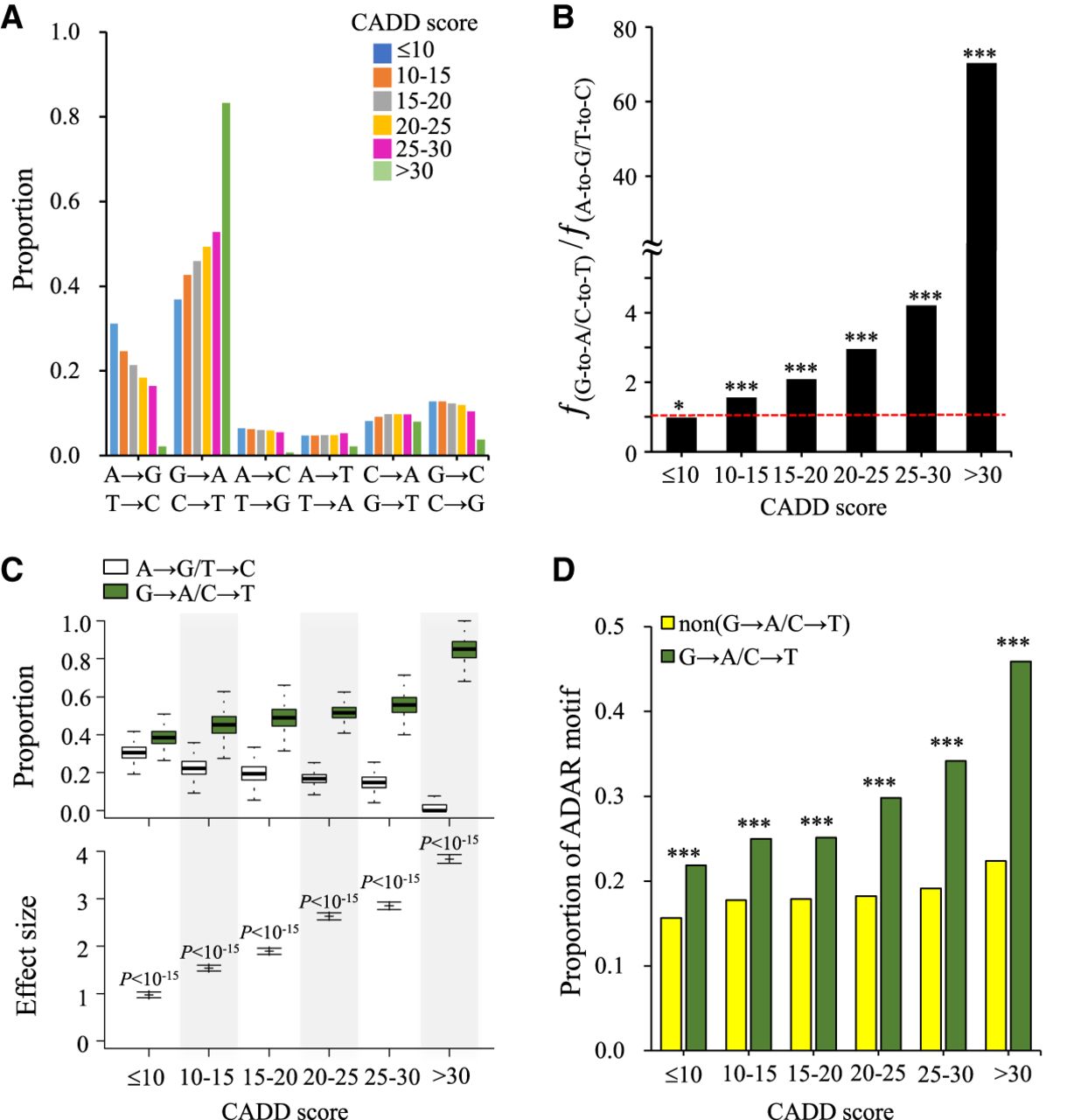 Relationship between the distributions of different types of rare missense mutations and A-to-G RNA editing. (A) Correlation between the distributions of different types of rare missense mutations from the 1000 Genomes Project and deleteriousness (measured by CADD scores) of the corresponding genomic changes. (B) Fraction of the frequency of nonsynonymous G-to-A/C-to-T changes to the frequency of nonsynonymous A-to-G/T-to-C changes (i.e., the ƒ(G-to-A/C-to-T)/ƒ(A-to-G/T-to-C) ratio) for different deleterious effects of the genomic changes. (C) Comparisons of the individual mutational burden of the two types of rare transition missense mutations (A-to-G/T-to-C and G-to-A/C-to-T) in the 1000 Genomes Project. The top panel represents the proportions of rare A-to-G/T-to-C and G-to-A/C-to-T missense mutations per individual for different CADD scores. The bottom panel represents the differences (effect sizes) in mutational burden between these two types of rare missense variants. Effect sizes were measured by Cohen's d, which was defined as the difference between both mean numbers of these two types of rare missense mutations divided by the standard deviation of the paired differences. The estimated 95% confidence intervals of effect sizes were plotted (see also Supplemental Table S3). (D) Comparisons of the proportions of SNP sites with the ADAR motif for different deleterious effects of G-to-A/C-to-T and non-G-to-A/C-to-T rare missense mutations. P-values were determined using a two-tailed Fisher's exact test (B and D) or a two-tailed Wilcoxon signed-rank test (C). (*) P-value < 0.05, (***) P-value < 0.001.