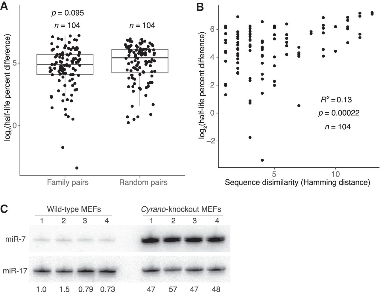 Features associated with rapid miRNA turnover. (A) Differences in half-life for pairs of family members or randomly paired guides. For each pair-wise comparison of all members within each miRNA family, half-life percent differences were computed as the absolute value of the difference between half-lives, divided by the mean of the two half-lives, with this fraction then multiplied by 100. The log2-transformed percent-difference values of all such comparisons in contact-inhibited MEFs are plotted (box, quartiles; whiskers, at most 1.5 times the inter-quartile range). Twenty-five equally sized cohorts of randomly paired guides were analyzed in the same way, with the cohort shown for comparison being the one with the median value of significance (P value, two-sample t-test). (B) Relationship between half-life difference and the number of nonidentical nucleotides (Hamming distance) when comparing pairs of family members. Only nucleotides 3′ of the seed region were considered for the Hamming-distance measurement. Greater Hamming distances represent more dissimilar sequences. Significance of the correlation was determined by a t-test. (C) The effect of Cyrano on steady-state miR-7 levels in contact-inhibited MEFs. Shown is a scan of a northern blot analyzing RNA from wild-type and Cyrano-knockout contact-inhibited MEFs. For each cell line, four biological replicates were analyzed, sequentially probing for miR-17, which served as a loading control, and then for miR-7. The fold-difference in miR-7 relative to the average miR-7 level in wild-type MEFs is shown below each lane.