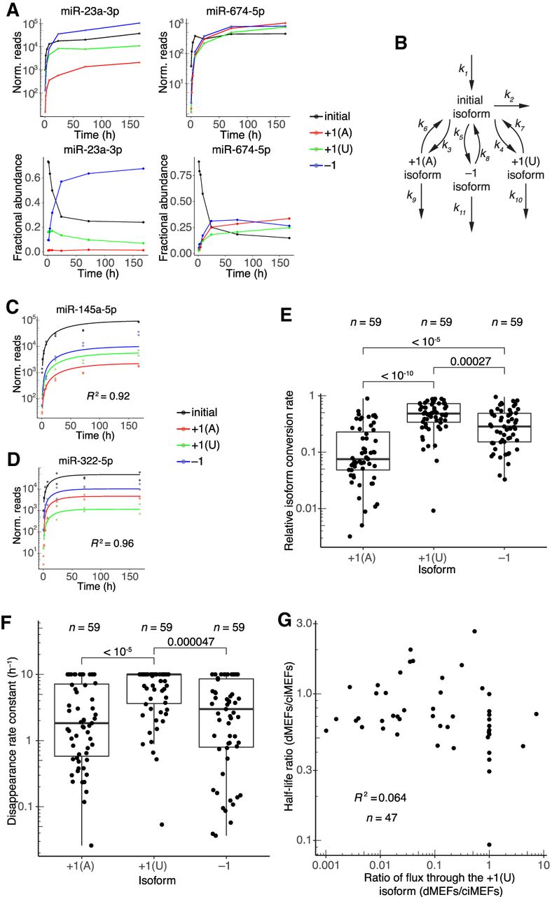 Dynamics of 3′-end isoforms. (A) Isoform accumulation for miR-23a-3p and miR-674-5p, two guide RNAs for which accumulation of derivatives of the initial isoform overtook that of the initial isoform. (Top) Absolute accumulation of the initial isoform (black) and its major derivatives, in which it is either trimmed by 1 nt (−1, blue) or tailed with either a single A (+1[A], red) or a single U (+1[U], green). Lines connect the mean values for each time point and do not represent fits to the data. (Bottom) Fractional abundance of the initial isoform and its major derivatives. (B) Schematic depicting the isoform-conversion model that was fit to the data and used for simulations. Arrows represent processes catalyzed by the cellular milieu of nucleotidyl transferases, phosphodiesterases, and other enzymes; the model is agnostic to the particular enzyme that carries out each reaction. Rate constants extracted from the fit are labeled (kn). Isoform nomenclature is as in A. (C,D) Representative examples of fits to isoform dynamics for miRNAs in contact-inhibited MEFs. Shown is the plot from the middle of the lowest quartile (miR-145a-5p, R2 = 0.92) and the plot from the middle of the highest quartile (miR-322-5p, R2 = 0.96) of goodness-of-fit (R2), when fitting data from both replicates. (E) Relative rates of conversion to the +1(A), +1(U), and −1 isoforms in contact-inhibited MEFs. Rate constants of conversion to each isoform (k3, k4, and k5 for +1(A), +1(U), and −1, respectively) were normalized to the summed conversion rate constant (k3 + k4 + k5) to generate the relative rates of conversion. Simulations indicated that conversion rate constants >1 h−1 could not be accurately fit, and thus conversion rate constants were capped at this value. Significance was evaluated with a Mann–Whitney U test, and P values are shown. (F) Rate constants for disappearance (k6 + k9, k7 + k10, or k8 + k11) of the +1(A), +1(U), and −1 isoforms, respectively, in contact-inhibited MEFs. Simulations indicated that disappearance rate constants >10 h−1 could not be accurately fit, and thus disappearance rate constants were capped at this value. Significance was evaluated with a Mann–Whitney U test, and all significant comparisons are indicated together with their P values. (G) Correlation between half-life ratios (dividing values from dividing MEFs by those from contact-inhibited MEFs) and ratios of the flux through the +1(U) isoform (again dividing values from dividing MEFs by those from contact-inhibited MEFs). Dividing MEFs are denoted as dMEFs; contact-inhibited MEFs are denoted as ciMEFs.