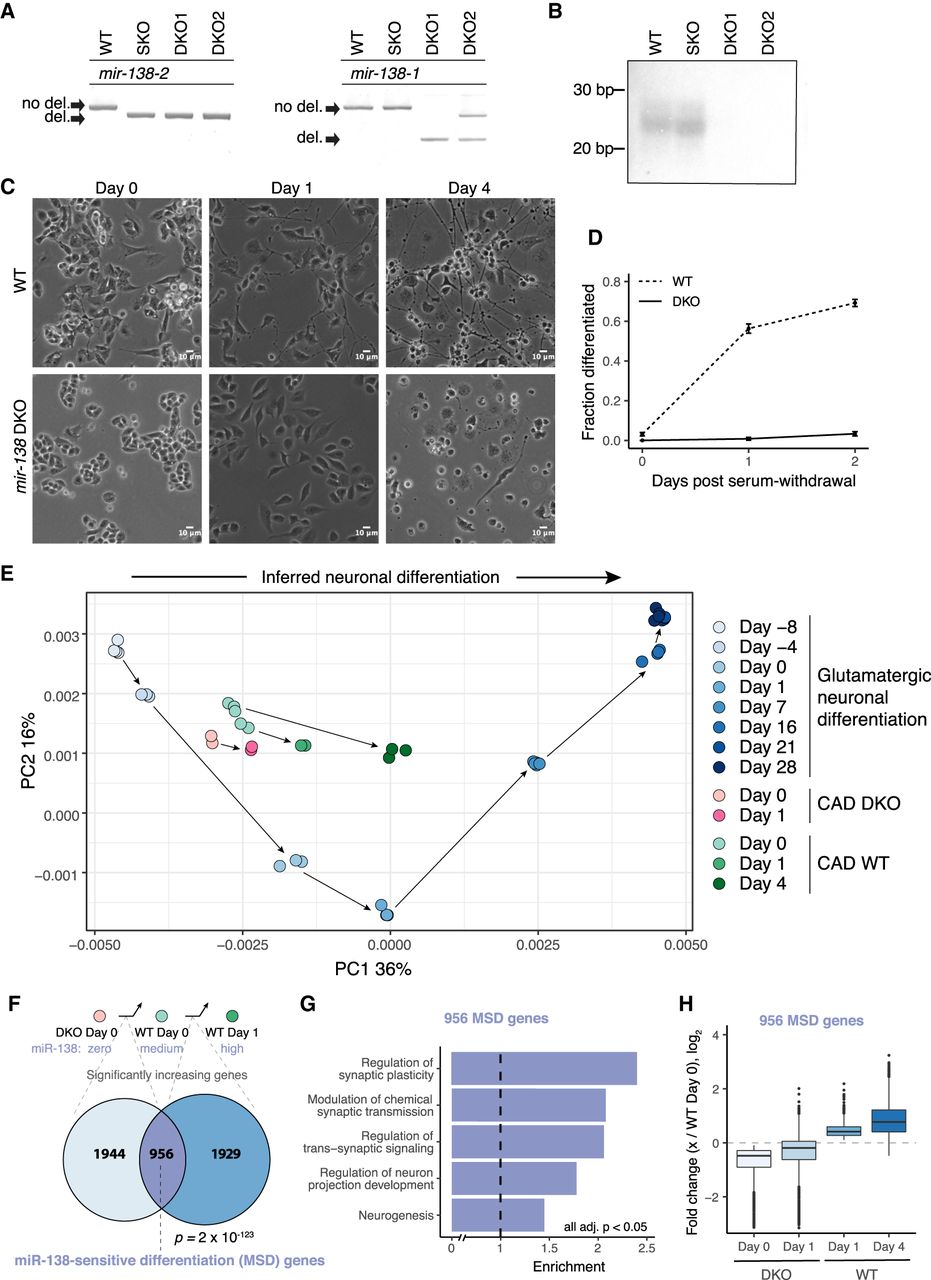 miR-138 is required for differentiation of CAD cells. (A) PCR of genomic DNA around the CRISPR-targeted sites of the two murine mir-138 loci, confirming deletion of both loci. Wild-type parental line (WT), SKO, and two DKO lines (DKO1 and DKO2) are shown. (B) Northern blot for miR-138 in the WT, SKO, DKO1, and DKO2 cell lines. (C) WT and DKO cells at 0, 1, and 4 d after serum withdrawal (10× magnification; scale bar indicates 10 µm); (D) quantitation of fraction of cells morphologically differentiated (Methods). The mean ± SD of three replicates with at least 100 cell counts each is shown. (E) PCA of RNA-seq data from eight time points of murine glutamatergic neuronal differentiation (shades of blue). RNA-seq data from CAD WT (0, 1, and 4 d after serum withdrawal; shades of green) and DKO cells (0 and 1 d after serum withdrawal; pink), projected onto PC1 and PC2 of the glutamatergic differentiation data. Arrows connect consecutive samples in each time series. The two sets of WT day 0 cells correspond to independent RNA-seq library preps and sequencing runs, as the day 0 and day 4 WT cells were sequenced in independent experiments. (F) Comparison of gene sets significantly increasing between DKO day 0 and WT day 0, and between WT day 0 and WT day 1. Significance of the 956 gene overlap (defined as MSD genes) was determined by chi-square test. (G) Gene Ontology enrichment of MSD genes against a background of genes significantly increasing in either DKO day 0 to WT day 0 or WT day 0 to WT day 1, with FDR-corrected P < 0.05 for all categories shown. (H) Fold change (log2) of the 956 MSD genes from WT day 0 to DKO day 0, DKO day 1, WT day 1, and WT day 4. See also Supplemental Figure S2 and Supplemental Tables S1 and S3.