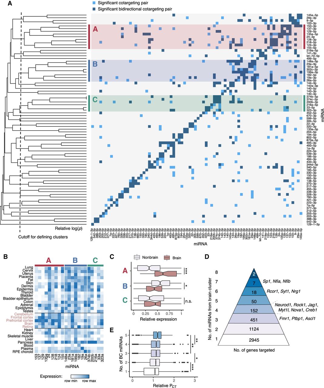 Patterns of cotargeting among pairs and groups of miRNAs. (A) Pairwise cotargeting relationships for 78 conserved miRNA families, showing unidirectional (light blue) and bidirectional (dark blue) significant cotargeting relationships with the reference miRNA on the y-axis (both with q-val < 0.05), and nonsignificant relationships (light gray). Rows were clustered using average linkage hierarchical clustering with distances defined as M − avg(−log10[pval]) from a binomial test of the extent of overlap of significant cotargeting relationships between rows, where M is the maximum −log(pval) observed. Vertical dotted line indicates cutoff distance (=2.8) at which clusters of five or more miRNAs were defined. Clusters are highlighted with red (cluster A), blue (cluster B), or green (cluster C). (B) Heatmap of miRNA expression clustering across human tissues (brain tissues labeled in pink). Samples are normalized to the maximum and minimum values in each row, and relative expression is expressed as (sample – min)/(max – min). (C) Box plots show relative expression of each miRNA in each cluster in brain tissues versus nonbrain tissues, grouped as in B; (*) significance by Kolmogorov–Smirnov test. (D) The number of genes predicted as targets of different numbers of miRNAs from the brain cluster, with selected genes listed at right. (E) Relative PCT scores (normalized to the transcriptome-wide mean PCT of sites for each miRNA) for miRNA sites in genes targeted by different numbers of brain cluster miRNAs. Wilcoxon rank-sum test: (*) P < 0.05, (**) P < 0.01, (***) P < 0.001. See also Supplemental Figure S4.