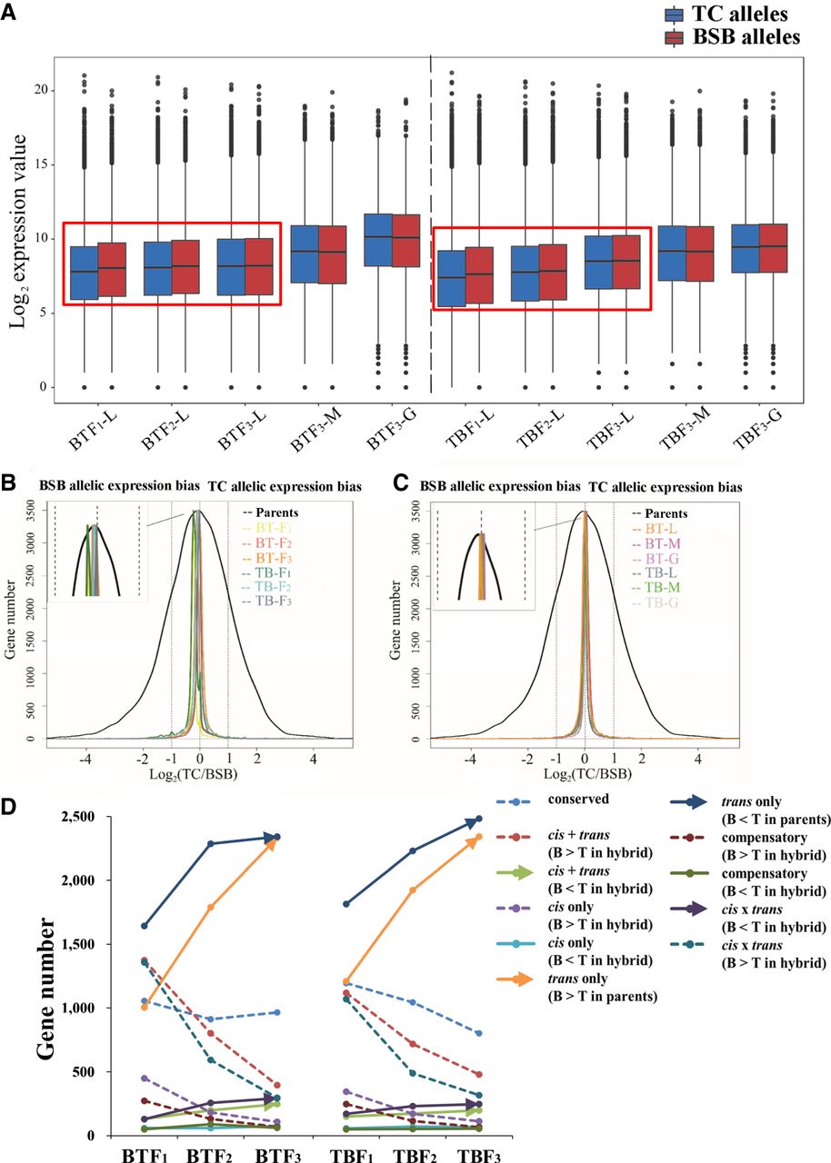 Allelic expression and cis- and trans-regulation in hybrids. (A) BSB and TC allelic expression values were observed in BT and TB. The black line in the box represents the median value. (B,C) The density distribution of log2(TC/BSB) values was determined in the parents and their hybrid offspring. This graph depicts the extent of allelic expression bias in three tissues: (L) liver; (G) gonad; (M) muscle. (D) Cis- and trans-regulation were observed in the livers of BT and TB. The arrows and the dotted lines represent gradual increasing and decreasing trends in gene number, respectively, from F1 to F3. The solid line represents the absence of an obvious trend.