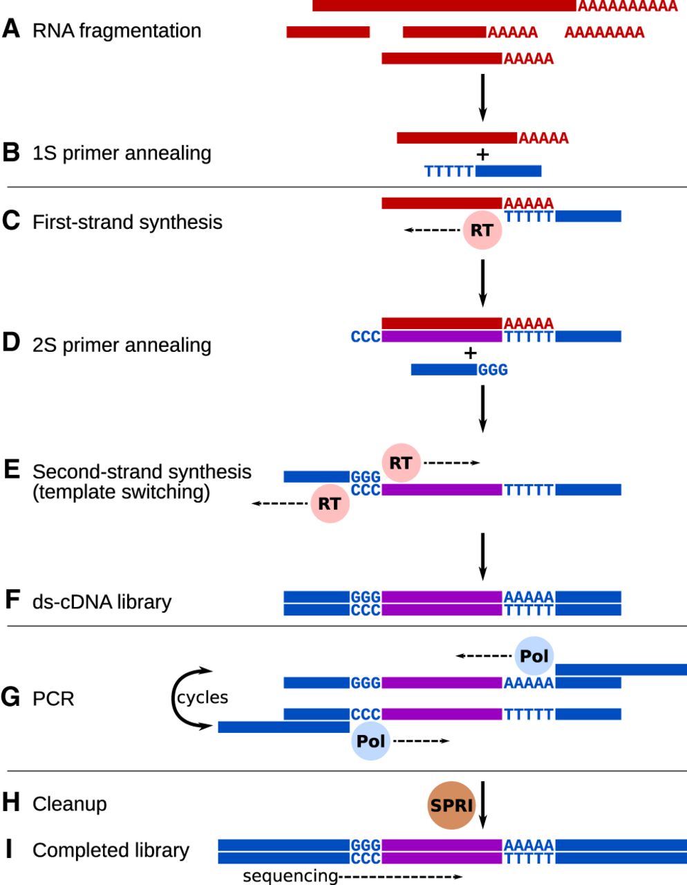 Conceptual diagram of the Smart-3SEQ library preparation method. Hands-on steps are separated by horizontal lines. (A) Total RNA is denatured and fragmented by hydrolysis. (B) The oligo(dT) primer, including a partial sequencing adapter, anneals at the beginning of the poly(A) tail. (C) Reverse transcriptase synthesizes first-strand cDNA from the RNA template and adds nontemplate dC at the end of the new strand. (D) The second primer, which includes a second partial sequencing adapter, anneals to the new dC overhang. (E) Reverse transcriptase synthesizes the second cDNA strand using the first as a template. (F) After steps C–E, which occur consecutively in one incubation, the result is a double-stranded cDNA library with partial sequencing adapters at both ends. (G) PCR with long primers amplifies the library and extends the adapters to full length, including multiplexing indexes. (H) The only cleanup step in the protocol uses paramagnetic SPRI beads to purify the amplified library while excluding adapter dimers and short inserts. (I) The final library contains the unknown cDNA sequence between the two sequencing adapters. The cDNA is sequenced in the orientation of the original RNA, yielding reads upstream of the end of the transcript (Supplemental Fig. S3). See Supplemental File 1 for a detailed technical description, Supplemental Figure S1 for a simplified diagram showing the practical workflow, and Supplemental Figure S2 for a detailed technical diagram.