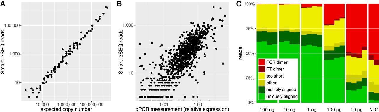 Technical validation of Smart-3SEQ with reference RNAs. (A) Standard curve from ERCC transcripts, r′ = 0.990. Each point represents one transcript sequence; the expected copy number is the estimated number of copies of that transcript in the RNA sample (1 µL at 1/10 dilution, 10 fmol total), and “Smart-3SEQ reads” is the number of postfilter reads aligned uniquely to any part of that transcript's sequence in the expected orientation (6.4 million). Data shown are from the first replicate of the condition with 10 fmol ERCC mix 2 and seven PCR cycles, which had the highest read count for that condition; data from all samples are shown in Supplemental Figure S6. (B) Comparison with TaqMan qPCR quantification of human transcripts, r′ = 0.854. qPCR measurements are normalized to the expression of RNA polymerase II. Data shown are from the first replicate of 100 ng UHRR, which had the highest read count for that amount of input RNA (2.7 million sense-aligned to annotated genes); data from all samples are shown in Supplemental Figure S13. (C) Alignability of Smart-3SEQ reads from human reference RNA dilutions and no-template controls.