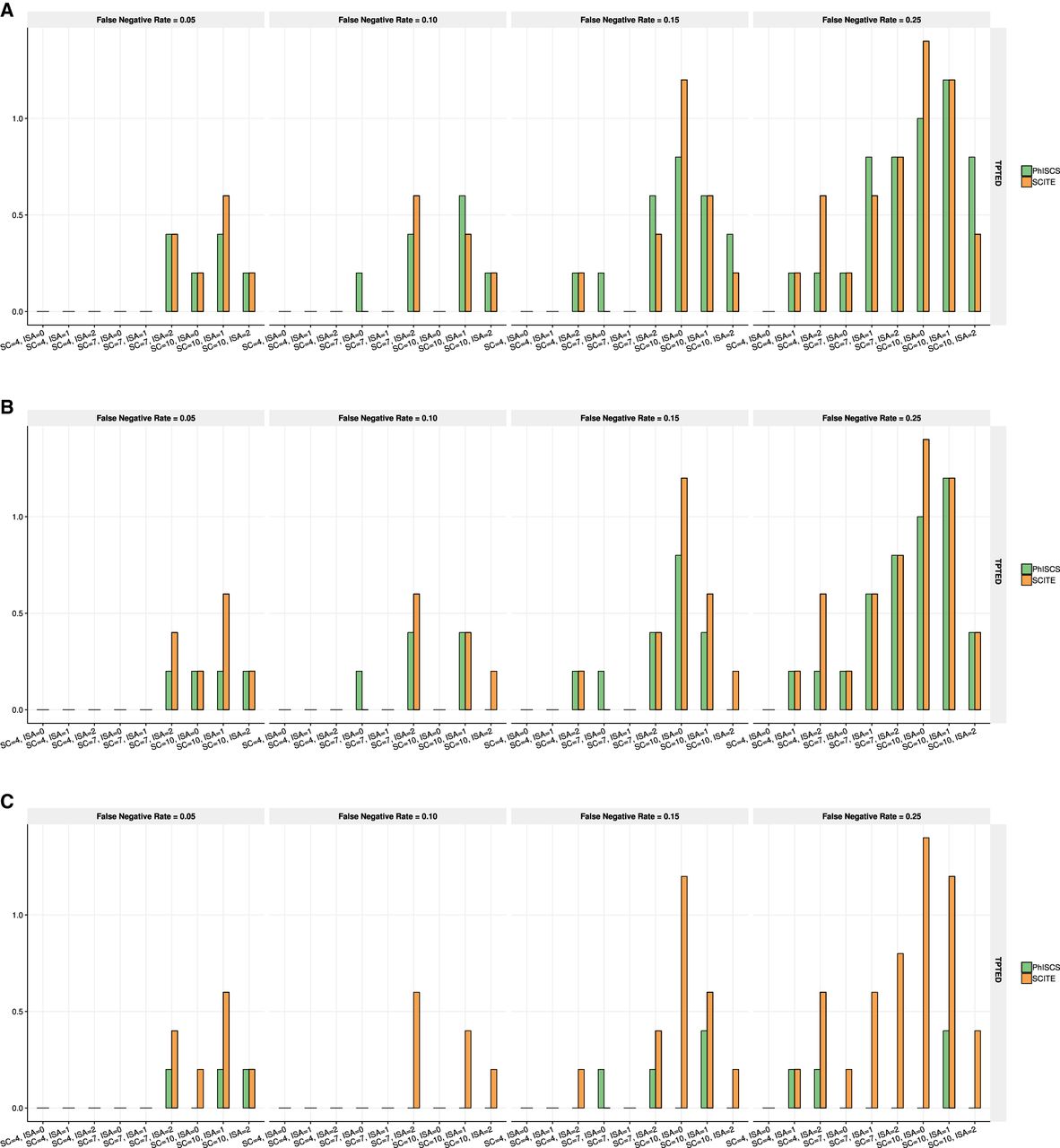 Comparison of PhISCS with SCITE based on TPTED dissimilarity measure. (A) TPTED values for SCS data when no ISA violations are allowed. (B) TPTED values when ISA violations are allowed in PhISCS. (C) TPTED values when ISA violations are allowed in PhISCS and both single-cell and bulk data are used as the input. In each case, 100 single cells were sampled and the total number of simulated mutations set to 40. In C, one bulk sample was used and coverage of bulk data was set to 10,000×. SC and ISA, respectively, denote the number of subclones and the number of simulated mutations for which ISA is violated. As our results illustrate, PhISCS has a comparable performance to SCITE in the cases when only SCS data is available; however, the addition of bulk sequencing data improves the performance of PhISCS substantially.