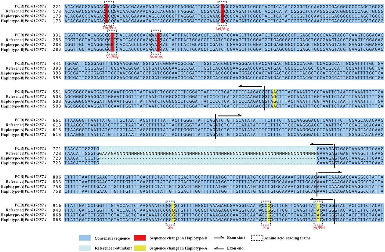 Mosaic assembly of Pbr017687.1 in the reference genome. Four base pairs in yellow only matched haplotype A, and 4 bp in red only matched haplotype B. Five of these eight sequences result in differences in amino acid sequence. (N) Redundant sequences in the reference.