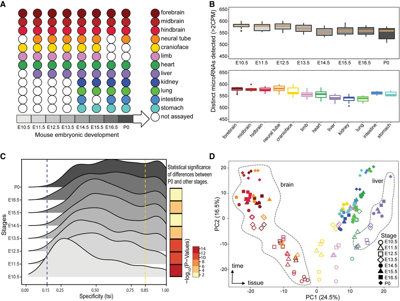 Overview of mouse ENCODE miRNA data sets. (A) Representative major organ systems were profiled in a time-course of mouse embryonic development. (B) Number of distinct miRNAs detected in different organs and developmental stages (minimum two CPM). There are no significant differences between the number of miRNAs detected at different stages or within different organs. Developmental stage and organ colors correspond to A. (C) The distribution of tissue specificity of miRNAs expressed at each developmental stage measured as tissue-specific index (TSI). The miRNAs are significantly more tissue-specific at stage of P0 compared with E10.5 (Kolmogorov–Smirnov [KS] test P-value < 2.2 × 10−16). (D) Principal component analysis (PCA) of 12 mouse organs across eight developmental stages. Organs are represented by various colors corresponding to A, whereas shapes denote the different developmental stages.