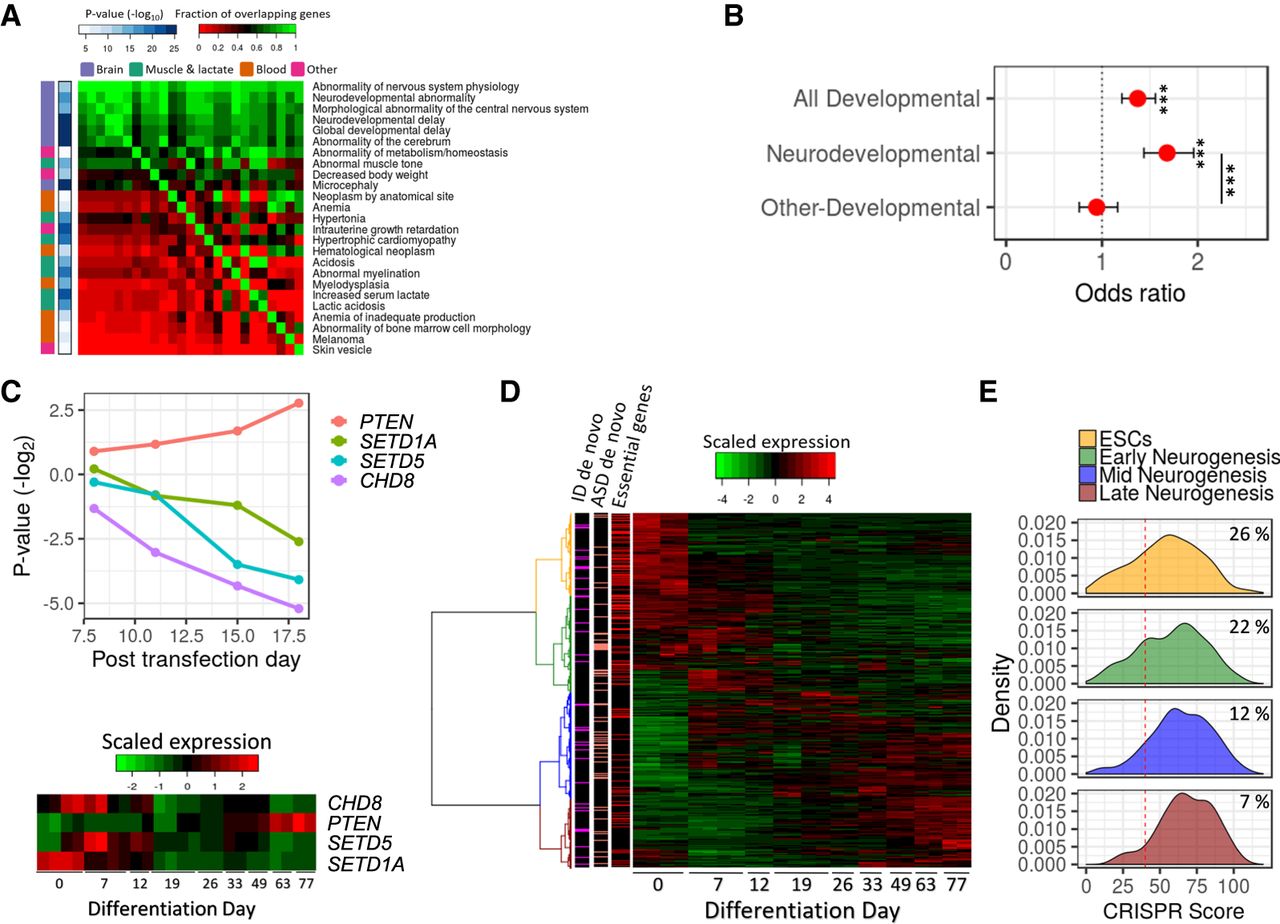 Essential genes in ESCs are associated with neurodevelopmental phenotypes. (A) Human phenotypes significantly enriched for essential genes. The phenotypes are ordered by the degree of overlap with other phenotypes. The color in the heat map corresponds to the degree of overlap in genes between phenotypes (red is low overlap; green is high overlap). The right-side bar indicates the significance level of the enrichment of each phenotype with essential genes. The left-side bar indicates the organs involved in the phenotypes. (B) Association between ESC-essential genes and risk genes for human developmental and neurodevelopmental disorders. Values are odds ratio ± 95% confidence interval. (***) Corrected P < 0.001. (C) (Top) Dynamic of gRNAs (average fold change) targeting four genes associated with neurodevelopmental disorders. (Bottom) The expression of the four genes during human in vitro corticogenesis. The colors of the heat map correspond to the normalized expression (red is high and green is low levels of expression). (D) A heat map of gene expression of risk genes for neurodevelopmental disorders during human in vitro corticogenesis. The colors of the heat map correspond to the normalized expression (red is high and green is low levels of expression). Side bars indicate ESC-essential genes (red), genes implicated in ASD by multiple de novo mutations (salmon), and genes implicated in ID by multiple de novo mutations (magenta). (E) Distribution of CRISPR scores for NDDs risk genes divided by expression patterns during human in vitro corticogenesis. The red line indicates a corrected P < 0.05. The numbers are the percentage of ESC-essential genes in each group.