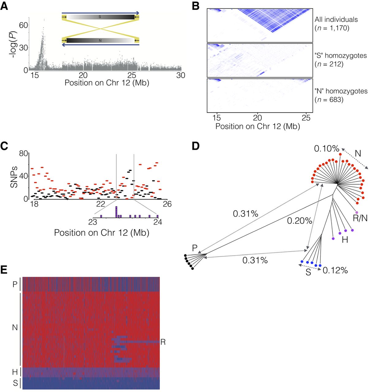 Identification of a 7.8-Mb inversion on herring Chromosome 12. (A) The spawning time contrast for Chromosome 12 highlights the block-like association pattern for the region from 17.9 to 25.6 Mb. The sketch shows the location of inverted repeats flanking the supergene. (B) LD patterns across the region in different groups of individuals sorted according to genotype for the putative inversion. (C) The distribution, as number of SNPs per 100 kb, of shared (black) and diagnostic (red) SNPs across the inversion region. Purple boxes (inset) are estimated locations of breakpoints in individuals that appear to carry a recombinant chromosome (see text). (D) Neighbor-joining tree based on genotypes for all SNPs in the inversion region called from individual whole-genome sequencing. The distances indicated across the tree are average nucleotide differences between haplotypes, either within groups (dashed) or between groups (solid). The letters designate the supergene type of the individual as follows: N = Northern homozygote; S = Southern homozygote; H = N/S heterozygote; R/N = individual carrying an N haplotype and a recombinant haplotype (see text); P = Pacific herring. (E) Heat map of the genotypes for diagnostic SNPs based on individual whole-genome sequencing. Supergene type of the samples is indicated as in D.
