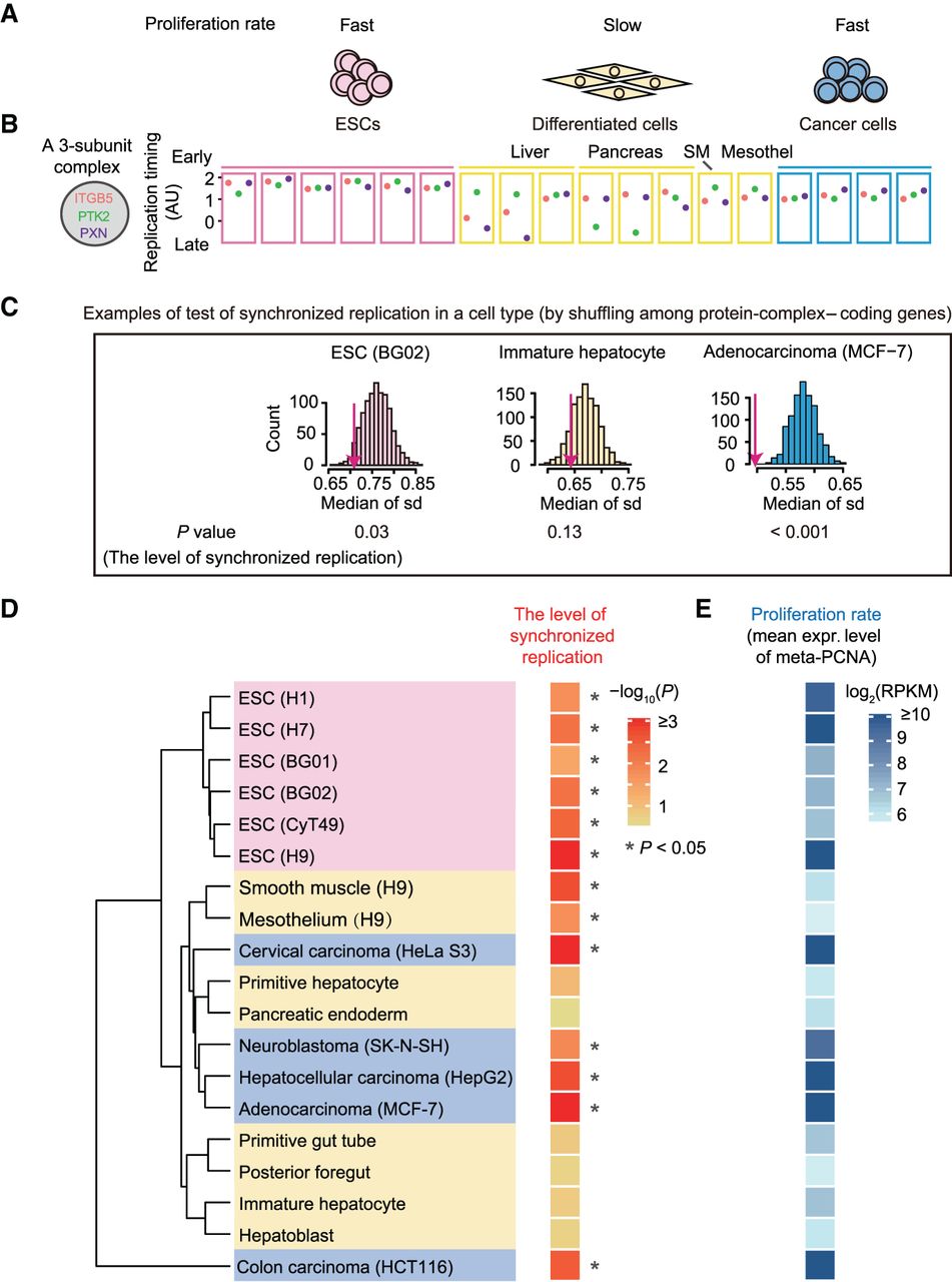 Synchronized replication of genes in the same protein complex occurs mainly in fast-proliferating cells. (A) Nineteen cell lines/types across ESCs, differentiated cells, and cancer cells are used to detect the synchronized replication. Differentiated cells include liver, pancreas, smooth muscle (SM), and mesothelial cells (mesothel) derived from hESCs. (B) Replication timing of three genes encoding a three-subunit protein complex in each cell line/type. HCT116 (shown in Supplemental Fig. S4A) is not shown here because it deviates from others in replication timing. (C) Three examples of the tests for synchronized replication. The observed median standard deviation (sd) of replication timing of genes encoding the same protein complex (magenta) is showed on the distribution of the random expectations (blue). (D) Synchronized replication occurs in 11 fast-proliferating cell lines and two slow-proliferating cell types. The dendrogram (left) shows the clustering of 19 cell lines/types based on the replication-timing profile of all protein-coding genes and was generated with Ward's method in the hclust function of R (R Core Team 2018). The heat map on the right shows the level of synchronized replication estimated from the permutation test. The asterisk indicates that replication is synchronized (P < 0.05) in the corresponding cell line/type. (E) The proliferation rate was estimated from the average expression level of 30 meta-PCNA genes.