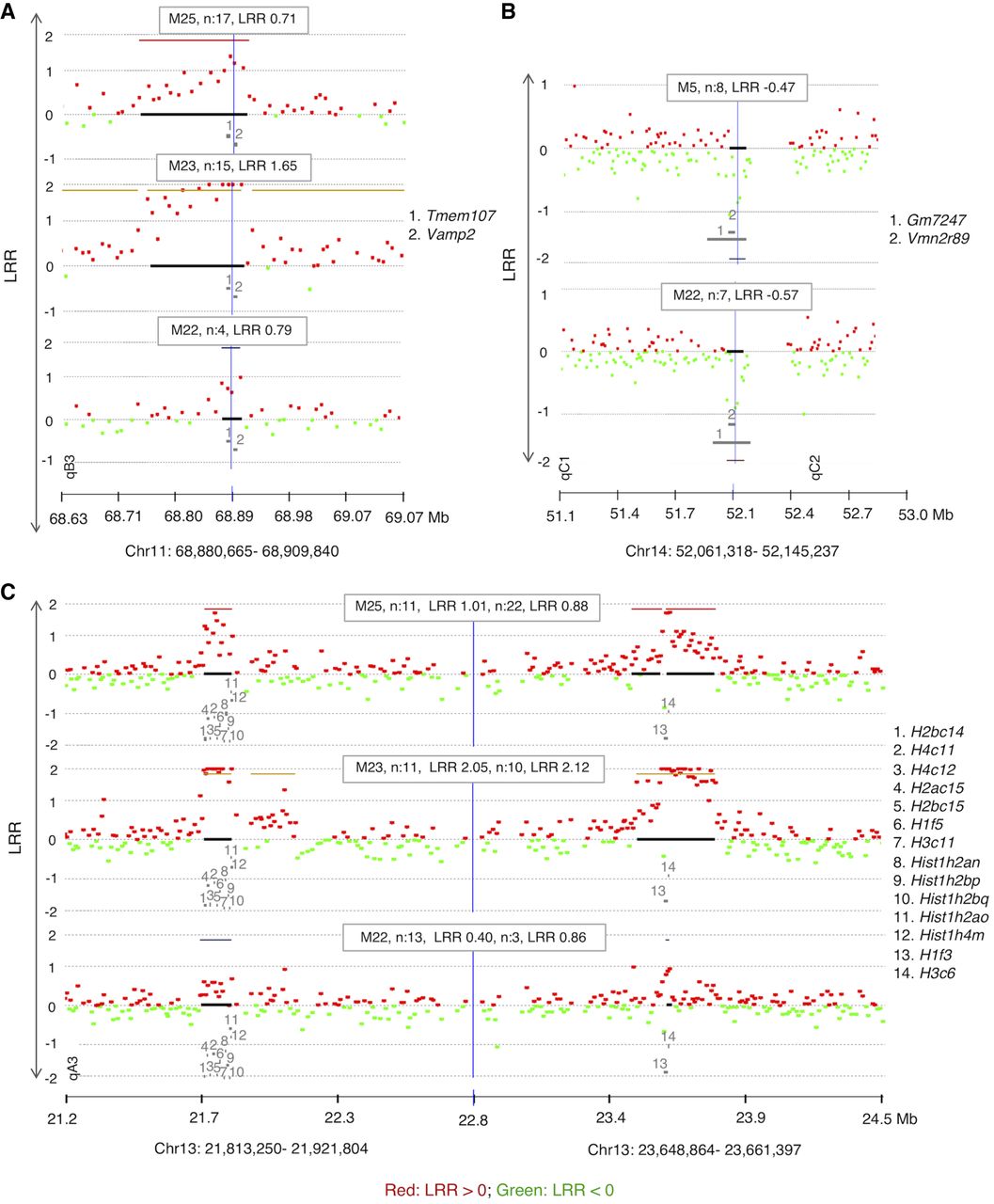 CGH array results showing recurrent CNAs in memory cells from PLNs of diabetic mice (n: number of affected probes, location of genes is indicated by numbers). (A) A recurrent copy gain in cells of three mice spanning several genes including Tmem107. (B) Recurrent copy loss spanning two undocumented genes (Gm7247 and Vmn2r89). (C) An independent recurrence of copy gain in three different mice that are spanning two Histone families’ loci. The formula to calculate the percentage of mosaicism of deletions is 100 ×(1–2LRR) × 2 (example: the percentage of mosaicism for −0.25 is 31.8% mosaicism and for −0.5 is 58.6%). DLRSpread values of samples are in Table 1 and Supplemental Fig. S2.