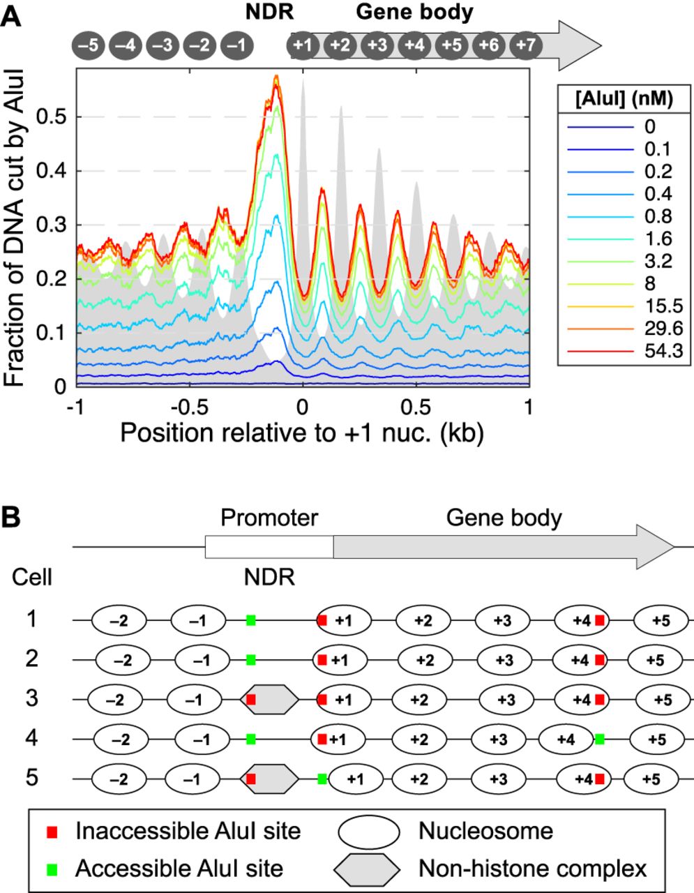 Genomic analysis of AluI accessibility reveals imperfect nucleosome phasing in yeast. (A) Mean accessibility as a function of distance from the center of the +1 nucleosome (defined by Chereji et al. 2018) on all approximately 5000 yeast genes. (B) Heterogeneous nucleosome positioning model to explain the AluI accessibility data. On a typical gene, nucleosomes are positioned slightly differently in each cell such that a particular AluI site is inside a nucleosome in one cell and in a linker in another cell. The cartoon shows the nucleosome positions on a gene in five different cells. An AluI site in the coding region is in the linker (accessible) in only one cell out of five (20% accessibility), whereas an AluI site in the promoter NDR is accessible in three out of five cells (60% accessibility). The observed average values are ∼25% in the coding region and ∼55% in the NDR (see A).