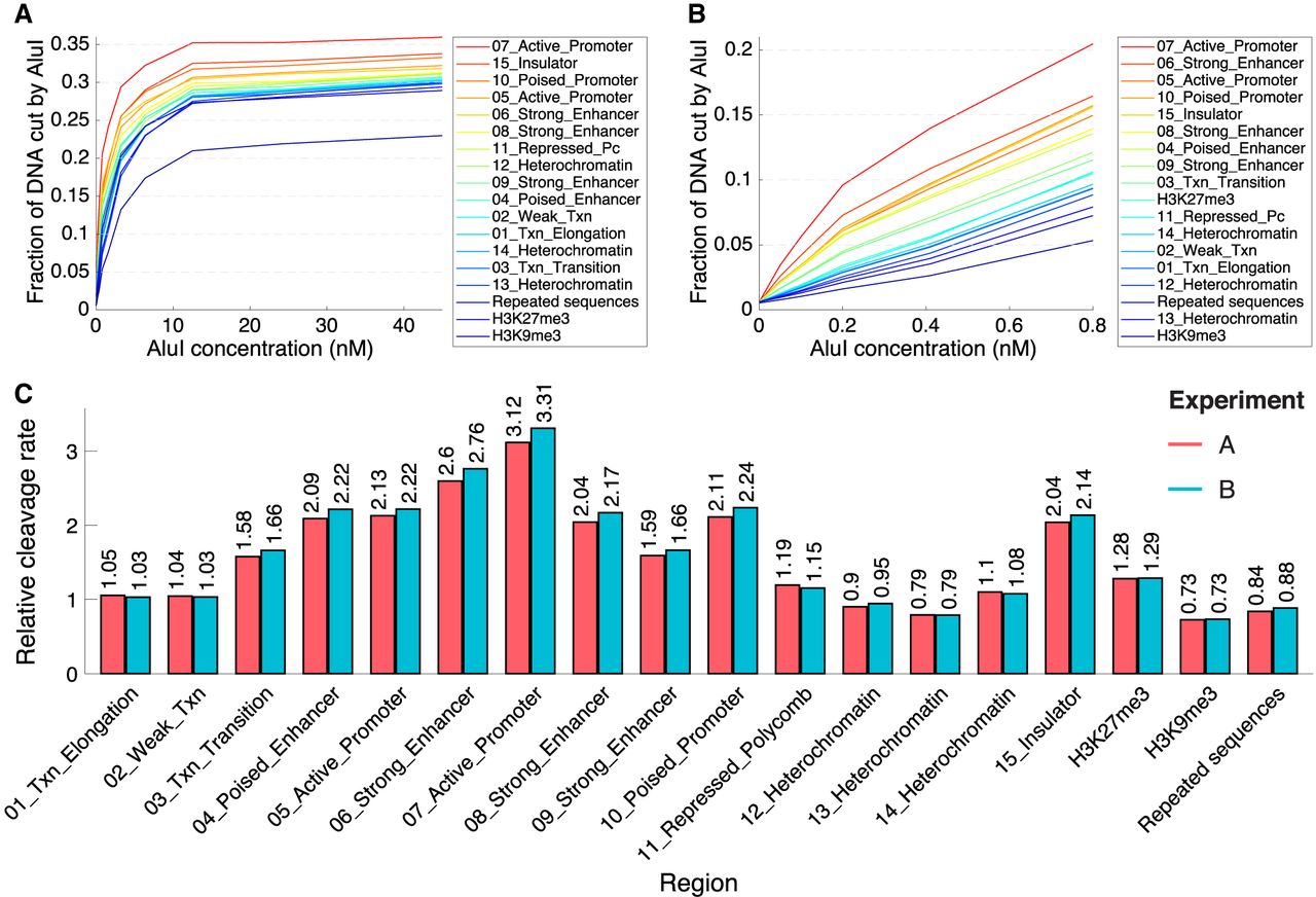 Heterochromatin and euchromatin have very similar DNA accessibilities in mouse hepatocytes. (A) AluI digestion kinetics for sites in the 15 epigenetic chromatin states in mouse hepatocytes defined by Bogu et al. (2016), for sites in repeated sequences (defined by RepeatMasker) and for sites marked by H3K9me3 (constitutive heterochromatin) or H3K27me3 (facultative heterochromatin) (data from Nicetto et al. 2019). (B) Initial rates of AluI digestion. (C) Quantitative comparison of initial digestion rates for the 15 epigenetic states defined by Bogu et al. (2016), repeated sequences, and regions marked by H3K9me3 or H3K27me3. Data for biological replicate experiments A and B are shown. See Supplemental Material for details of the analysis.
