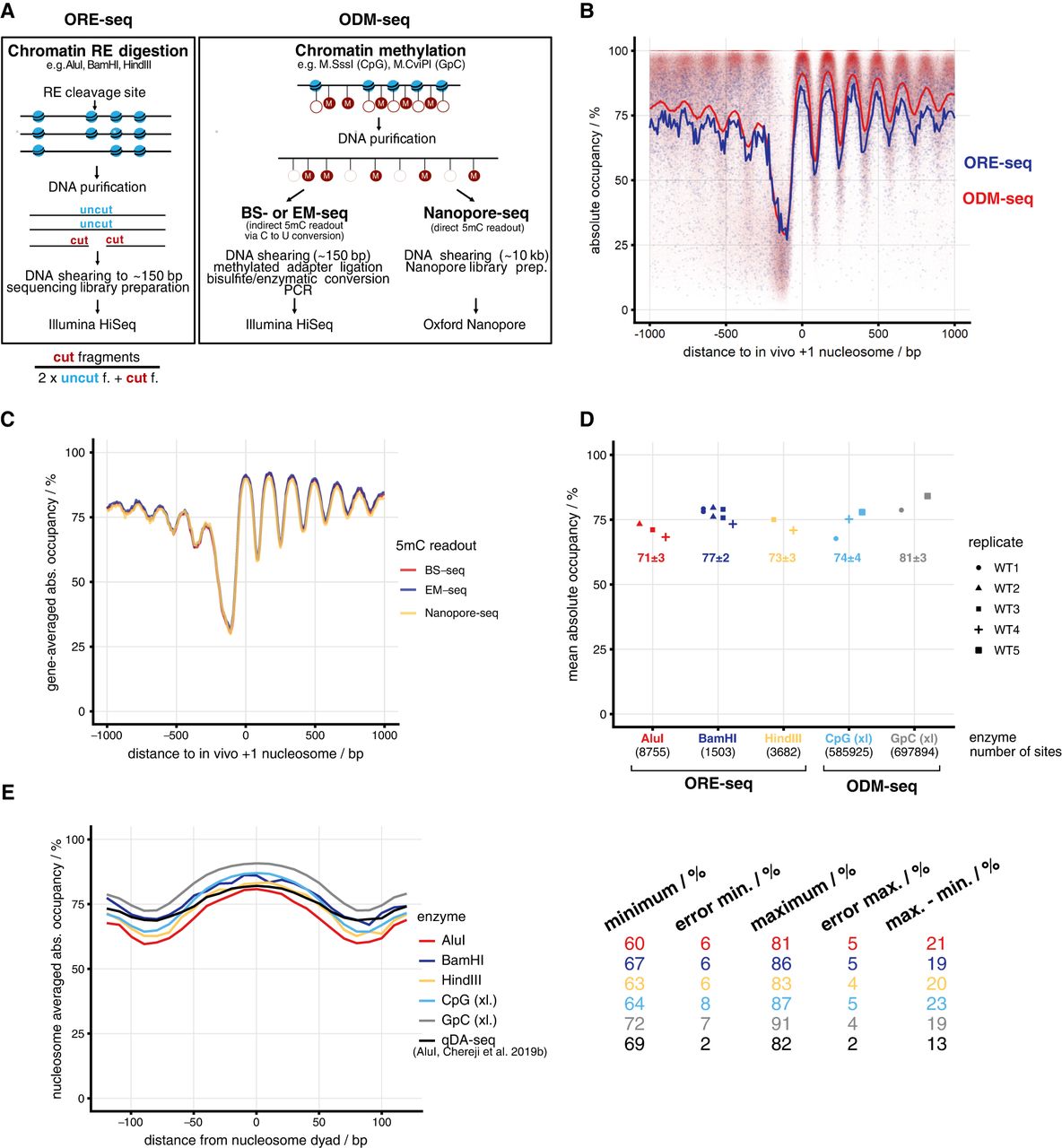 Genome-wide absolute occupancy measurement by restriction enzymes and DNA methyltransferases. (A) Method overview; for details, see text. Lollipops stand for DNA methylation sites: (open) unmethylated; (red fill “M”) methylated; (f.) fragments. (B) Composite plot of absolute occupancy ORE-seq and ODM-seq data averaged over all included samples and aligned at in vivo +1 nucleosome positions. Each dot represents the value of one genomic site, and the lines show the 10-bp bin mean occupancy of aligned sites. (C) As in B, but for WT5 replicate and the different 5mC readouts stated in A. (D) Absolute occupancy averaged over all sites (mean absolute occupancy) obtained by ORE-seq (Supplemental Table S3) or ODM-seq (Supplemental Table S4) for the indicated enzymes and biological replicates (WT1 to WT5) at saturation conditions. The number of sites implemented for each enzyme is indicated. (xl.) in vivo formaldehyde cross-linked. (E) Absolute occupancy values averaged in 10-bp bins around nucleosome dyads called from chemical cleavage-seq data (Chereji et al. 2018) and averaged over all replicates for the indicated enzymes. qDA-seq data are taken from Chereji et al. (2019b). On the right, absolute occupancy values and errors (mean over sites in the bin of the standard deviation among samples) are shown for the maxima and minima of each plot as well as the difference between maximum and minimum values for each enzyme.