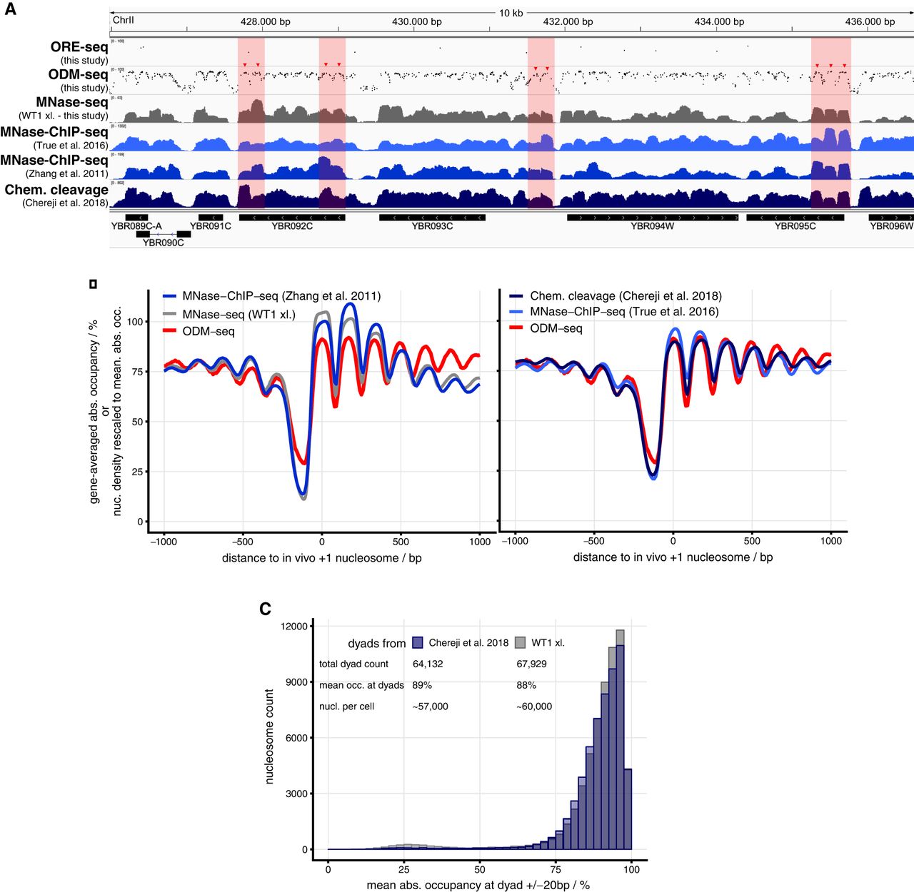 The ODM-seq absolute occupancy map. (A) Integrated Genome Viewer (IGV) browser shots comparing the indicated data sets (Supplemental Table S2) with our ORE-seq and ODM-seq absolute occupancy data. Regions in light red highlight pronounced differences in occupancy/signal between methods. (B) As in Figure 1C but for the indicated data sets. Because the external data do not provide absolute occupancy, we globally rescaled their signal to have the same genomic mean as the absolute occupancy map. Here and in following cases, nucleosome dyads of external data sets were extended to 147 bp. (C) Histogram of absolute occupancy at nucleosome positions called from the indicated data sets.