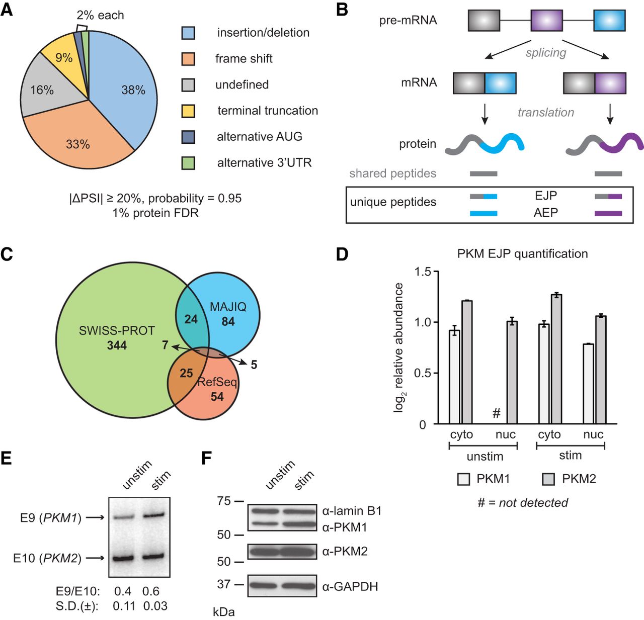 Identification of proteoforms by MS. (A) Pie chart of effect of alternative splicing (AS) events on protein sequence, based on the CDS cassette exons from Figure 1. (B) Schematic representation of AS leading to exon junction peptides (EJPs) and alternative exon peptides (AEPs), which distinguish AS proteoforms. (C) Venn diagram showing the number of peptides that report on alternate proteoforms as identified by SWISS-PROT (canonical + isoforms), our customized MAJIQ junction usage database, and/or RefSeq three-frame translation of transcripts (1% FDR). (D) Quantification of PKM EJP relative abundance by MS-DIA. (E) RT-PCR analysis of PKM-E9 (upper band) and -E10 (lower band) inclusion upon T-cell stimulation. Bands were detected with a Typhoon Phosphorimager and quantified with ImageQuant software (n = 3 per condition). (F) Western blot of PKM1 and PKM2 isoforms in unstimulated and stimulated conditions (5 μg whole-cell extract per lane). Lamin B1 and GAPDH were used as loading controls.