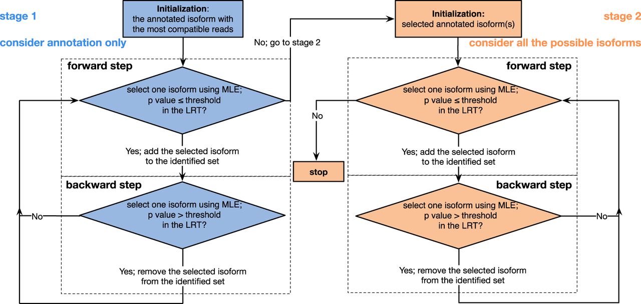 Workflow of the stepwise selection in the AIDE method. Stage 1 starts with a single annotated isoform compatible with the most reads, and all the other annotated isoforms are considered as candidate isoforms. Stage 2 starts with the annotated isoforms selected in stage 1, and all the possible isoforms, including the unselected annotated isoforms, are considered as candidate isoforms. In the forward step in both stages, AIDE identifies the isoform that mostly increases the likelihood, and it uses the LRT to decide whether this increase is statistically significant. If significant, AIDE adds this isoform to its identified isoform set; otherwise, AIDE keeps its identified set and terminates the current stage. In the backward step in both stages, AIDE finds the isoform in its identified set such that the removal of this isoform decreases the likelihood the least, and it uses the LRT to decide whether this decrease is statistically significant. If not significant, AIDE removes this isoform from its identified set; otherwise, AIDE keeps the identified set. After the backward step, AIDE returns to the forward step. AIDE stops when the forward step in stage 2 no longer adds a candidate isoform to the identified set.