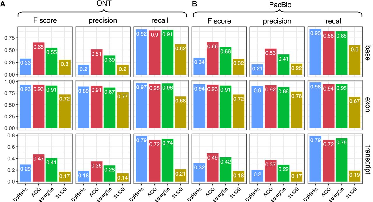 Evaluation of isoform discovery methods based on long reads. The F1-score, precision, and recall of the four discovery methods were calculated at the base, exon, and transcript levels. (A) Evaluation based on isoforms identified by ONT. (B) Evaluation based on isoforms identified by PacBio.