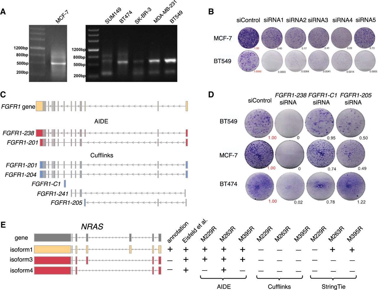 AIDE identifies isoforms with biological relevance. (A) PCR experiments validated the expression of FGFR1-238 in breast cancer cell lines MCF-7, SUM149, BT474, SK-BR-3, MDA-MB-231, and BT549. (B) Long-term colonegenic assay with Lipofectamine 3000 controls (“siControl”) and FGFR1-238 knockdowns. Tumor growths relative to the siControl were quantified by the ImageJ software (Schneider et al. 2012). (C) FGFR1 isoforms identified by AIDE and Cufflinks. (D) Long-term colonegenic assay with siControl (negative control), si-FGFR1-238 (positive control), si-FGFR1-205, and si-FGFR1-C1. Tumor growths relative to the siControl were quantified by the ImageJ software. (E) NRAS isoforms in the GENCODE annotation, reported by Eisfeld et al. (2014) and discovered by AIDE, Cufflinks, or StringTie in three melanoma BRAF inhibitor–resistant cell lines: M229R, M263R, and M395R.