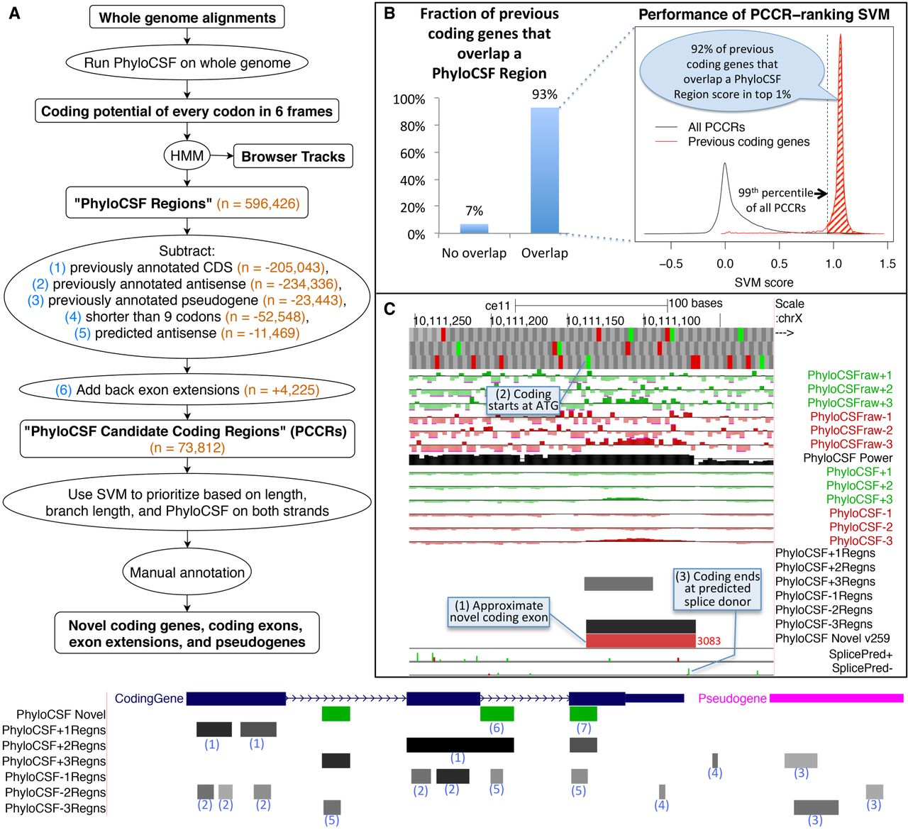Computing PhyloCSF Candidate Coding Regions (PCCRs). (A) Flow chart of overall process. Numbers in orange are counts for the human hg38 assembly relative to the GENCODE v23 gene set. The hypothetical browser image at the bottom illustrates how the PhyloCSF Regions list is pruned to define PCCRs. In the vicinity of a coding gene (blue) and a pseudogene (pink), we initially have a set of intervals in each of the six possible reading frames (“PhyloCSF Regions”) that are more likely to be in the coding state than noncoding state of the HMM (gray-scale intervals in the six “PhyloCSF*Regns” tracks). We then exclude any that overlap known coding genes in the same frame (1) or anti-sense frame (2) or that overlap known pseudogenes in any frame on either strand (3). Next, we exclude regions less than nine codons long (4) and regions predicted by our antisense SVM to be likely antisense regions (5). Finally, we add back nonoverlapping fragments of PhyloCSF Regions that partly overlap annotations because these could be extensions of known exons (6). The resulting PCCRs are shown in green. These sometimes overlap known coding regions, and this is an indication that the PhyloCSF signal is in a different frame from the annotated one (7). The resulting PCCRs are then ranked by an SVM and investigated by expert manual annotators to find novel coding regions and pseudogenes. (B) Performance on previously annotated coding genes. Column chart on the left shows the fraction (93%) of GENCODE v23 coding genes that overlap at least one PhyloCSF Region; the remaining 7% could not have been identified by our workflow. Density plot on the right measures the efficiency of our PCCR-ranking SVM by showing SVM scores for all PCCRs (black) and scores of the highest-scoring PhyloCSF Region that overlaps each GENCODE v23 coding gene that overlaps at least one PhyloCSF Region (red). For 92% of such coding genes, the score is in the 99th percentile of scores of PCCRs (shaded area), indicating that manual examination of the top-ranked 1% of PCCRs would have uncovered each of these coding genes if it had not been known previously, and suggesting that most true novel coding genes could be identified by examining the best ranking PCCRs. (C) PhyloCSF tracks in UCSC Genome Browser showing the “−” strand of C. elegans Chromosome X. Upper six green and red “PhyloCSFraw” tracks show the raw PhyloCSF score for each codon in each of six reading frames. The black “PhyloCSF power” track indicates the relative branch length of the local alignment, a measure of the statistical power available to PhyloCSF; there is near full alignment for the first approximately three-fourths of the track, but then there are fewer aligned species for the remaining one-fourth. Codons having relative branch length less than 0.1 show no scores. The next six green and red “PhyloCSF” tracks show the PhyloCSF scores smoothed by the HMM. The six “PhyloCSF*Regns” tracks show PhyloCSF Regions, with gray scale indicating the maximum probability of coding. The “PhyloCSF novel” track shows the PCCRs in all six frames combined into a single track with green and red intervals indicating the plus and minus strands, respectively, and with the rank of the region within the list of PCCRs shown next to the region, with lower ranks indicating stronger likelihood of coding. The two “Splice Pred” tracks show splice donor (green) and acceptor (red) predictions at GT and AG dinucleotides, respectively, on the plus and minus strands, with the height of each bar indicating the strength of the splice prediction. In the example shown, the tracks allow us to conjecture that there is a novel coding exon on the minus strand roughly coinciding with the 3083rd PCCR (1), extending from the ATG indicated by the small green rectangle in the third base position track at the top (2) up to the green splice donor prediction in the “SplicePred−” track (3).