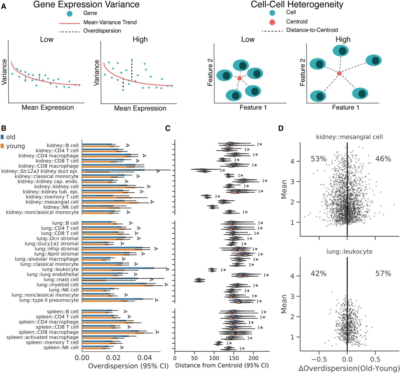Changes in cell–cell heterogeneity with age depend on cell identity. (A) Diagram illustrating the difference between gene expression variance (left) and cell–cell heterogeneity metrics (right). Gene expression variance measures the variance of the average gene in a manner that controls for mean expression levels. Cell–cell heterogeneity measures the average difference between cells across genes. Examples of data providing high and low values for each metric are schematized. (B) Overdispersion values for each cell identity conditioned on age. We computed overdispersion as the residual dispersion of each gene after accounting for mean expression level with a rolling median dispersion spline (difference from the median method). Each point in the underlying data represents a single gene. Many cell identities do not show a substantial shift in the overdispersion distribution. Some identities show increased mean overdispersion with age, whereas others show a decrease: (*) Wilcoxon rank-sum test, Q < 0.05. (C) Cell–cell heterogeneity measurements based on Euclidean distances to the population centroid for each cell identity and age. We computed Euclidean distances to the centroid for each cell using all measured genes. Each point in the underlying data represents a single cell. Most cell identities showed increased cell–cell heterogeneity in old cells: (*) Wilcoxon rank-sum test, q < 0.05. However, some identities show decreased heterogeneity with age (kidney::CD8 T cell; kidney::classical monocyte). (D) Difference in overdispersion between old and young cells (ΔOverdispersion) as a function of mean gene expression value in VIM-positive kidney capillary endothelial cells (upper) and lung leukocytes (lower). Each point represents the change in overdispersion and mean expression value for a single gene. Shading reflects the density of points. We found that genes within a cell identity show heterogeneous changes in overdispersion with age.