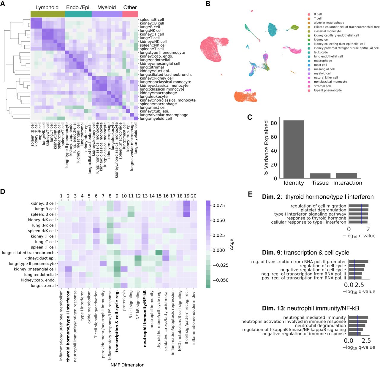 Cell identity and tissue environment influence aging trajectories. We computed aging trajectories as the distance between young and old cell centroids in a non-negative matrix factorization (NMF) low-rank embedding of each cell. We embedded all cells in a common non-negative latent space, where each latent dimension is associated with the activity of particular genes. (A) Cosine similarities between the aging trajectories of each cell state in each tissue are compared in a heatmap. Hierarchical clustering of aging trajectories revealed that similar cell types have similar trajectories. In contrast, different cell types from the same tissue did not cluster together. We labeled clusters based on their constituent cell types above. (B) A UMAP visualization derived from the 20-dimensional NMF embedding with cell types overlaid as colors. The NMF embedding retains biological variation between cell types. (C) Variance in the aging vectors of immune cell types found in all three tissues explained by cell type, tissue environment, and their interaction (ANOVA). (D) Heatmap visualization of the aging vectors for lymphocyte and endothelial/epithelial cell types. Endothelial/epithelial cell types and lymphoid cell types were identified by clustering aging vectors, presented in A. Semantic descriptions of each embedding dimension derived from gene enrichment analysis are presented as column labels. Some expression programs show common changes with age across both groups of cell types, whereas others appear to be different between groups. We highlight three expression programs that show cell-identity-specific changes (bold). (E) Gene Ontology enrichment analysis results for selected dimensions of the NMF embedding.