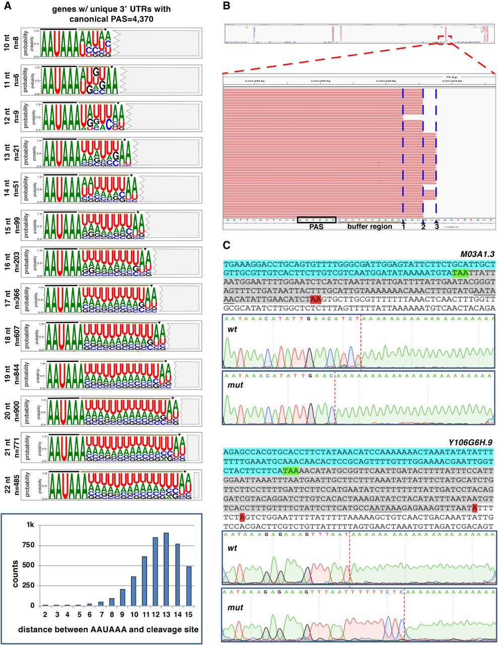 A terminal adenosine nucleotide is required at the cleavage site for correct cleavage. (A) Sequence logos produced from 3′ UTRs of genes only with 3′-UTR isoforms containing the canonical PAS element “AAUAAA” and aligned by their respective buffer region length (n = 4374). Two extra nucleotides are included downstream from each cut site (triangle), highlighting the terminal UA dinucleotide. The nucleotide distribution of the distance between the PAS element and the cleavage site is shown in the bar chart below. (B) Example of slight variability in the cleavage site for the gene C09G9.8. Although prevalent forms are observed, the exact cleavage site varies on several occasions, but it predominantly occurs at a different adenosine nucleotide. (C) Test of the role of the terminal adenosine nucleotide in the cleavage reaction. The 3′-end regions of several test genes were cloned and used to prepare transgenic C. elegans strains expressing this region with or without mutated terminal adenosine nucleotides (red, see below). The top sequence shows the test 3′-end region: (cyan) ORF; (green) translation STOP signal; (gray) 3′ UTR; (red) terminal adenosine nucleotide. The PAS element is underscored. The Sanger trace files show the outcome of the cleavage site location in selected clones. Two genes are shown (M03A1.3 and Y106G6H.9). In the case of M03A1.3, the loss of the terminal adenosine nucleotide sometimes forces the CPC to backtrack and cleave the mRNAs upstream of the regular cleavage site but still at the closest adenosine nucleotide available. In the case of the gene Y106G6H.9, the loss of the terminal adenosine nucleotide forces the complex to skip the cleavage site, which sometimes occurs at the next purine nucleotide. Additional clones and more test genes are shown in Supplemental Figures S11–S13.