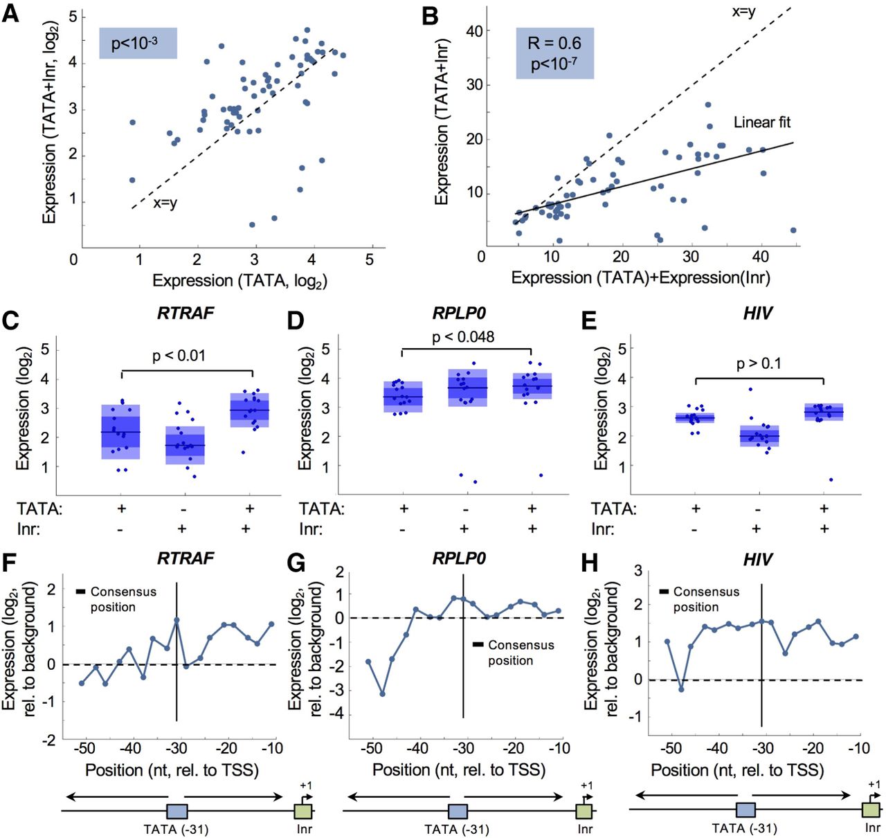 The effect on expression of TATA-box and Initiator (Inr) combinations and relative distances in different backgrounds. (A) Comparison of expression levels of synthetic oligos with TATA to those containing both TATA and Inr. Each dot represents a pair of sequences with either TATA or TATA+Inr elements. An increase in expression is observed when adding Inr (P < 10−3, Wilcoxon signed-rank test). (B) Testing for synergy between TATA and Inr elements. Each dot represents a pair of expression values. On the x-axis, expression was computed as the sum of the expression of separate oligos with either TATA or Inr. The y-axis represents expression measurements of oligos that contain the two elements. (C–E) Comparison of oligos with either TATA, Inr, or TATA+Inr in three different promoter backgrounds. Presented P-values were computed by Wilcoxon rank-sum test (n = 16 in each group). (F–H) Testing the effect of the distance between the TATA and the Inr in three different backgrounds. We designed oligos in which we placed the Inr in its consensus position and systematically changed the location of the TATA (2- to 3-nt increments). Each blue dot represents the expression level at a single position. The consensus position of the TATA (−31) is denoted.