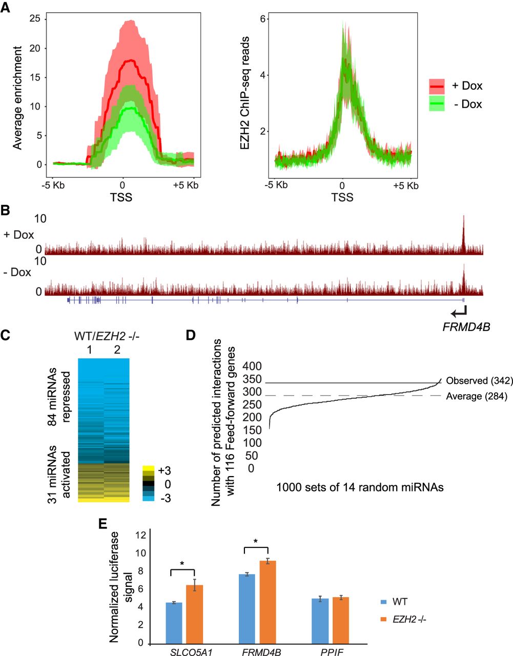 (A) Normalized density of EZH2 ChIP enrichment scores (−log10 Q-value calculated using MACS2, left) and EZH2 ChIP-seq reads (right) in the 10-kb region spanning the TSS of the feed-forward regulated genes in cells treated with Dox (+ Dox) and untreated (− Dox). (B) Genome Browser view of FRMD4B showing tracks for EZH2 ChIP-seq in WT +Dox and WT −Dox cells containing VP55. (C) Heat map showing differential expression of miRNAs in response to EZH2 knockout. Rows are ordered from low to high log2 fold change between WT and EZH2−/− miRNA counts. (D) Predicted interactions between 1000 random sets of 14 miRNAs and feed-forward regulated genes. The average across 1000 intersections is marked “Average.” The number of observed interactions between EZH2-activated miRNAs and feed-forward regulated genes is marked “Observed.” P-value = 0.024 was calculated using the bootstrap method (Methods). (E) Luciferase assay comparing miRNA inhibition of WT 3′ UTR transfected into WT and EZH2−/− cells.