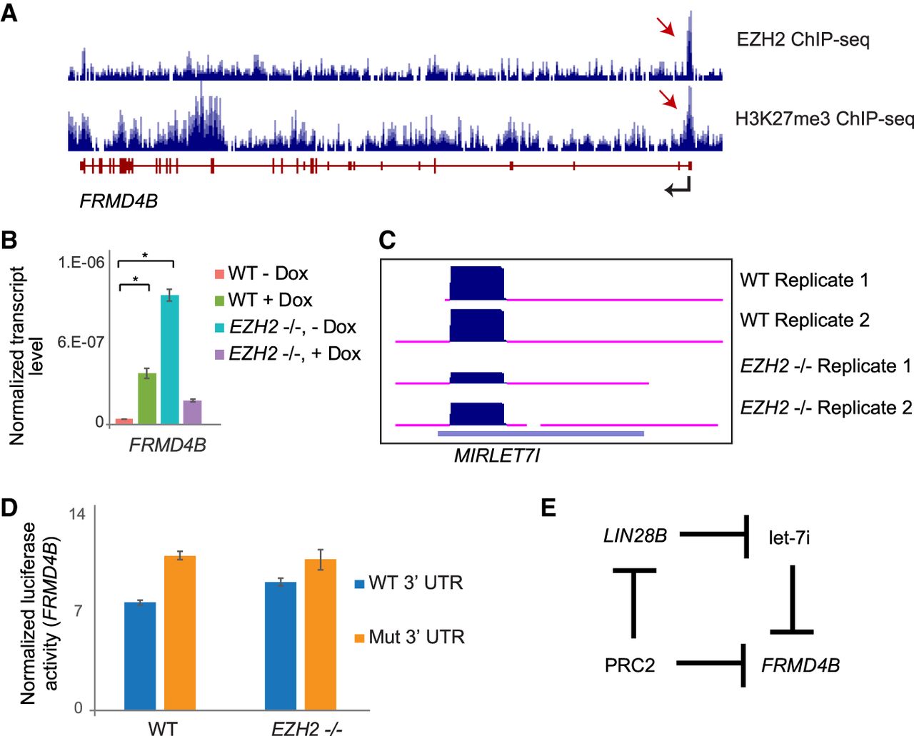 PRC2 regulates FRMD4B expression through a feed-forward regulatory network with let-7i. (A) Genome Browser view of FRMD4B showing tracks for EZH2 and H3K27me3 ChIP-seq. (B) qRT-PCR showing expression changes of FRMD4B in miRNA-depleted (+ Dox) and nondepleted (− Dox) WT and EZH2−/− cells, plotted as in Figure 1E. (*) P < 0.05. (C) Genome Browser view of let-7i in two replicates of WT and EZH2−/− cells. (D) Luciferase assay comparing miRNA inhibition between WT and mutant FRMD4B 3′ UTR (seed deletion) transfected WT and EZH2−/− cells. (E) Feed-forward regulatory network formed by PRC2, LIN28B, let-7i, and FRMD4B.