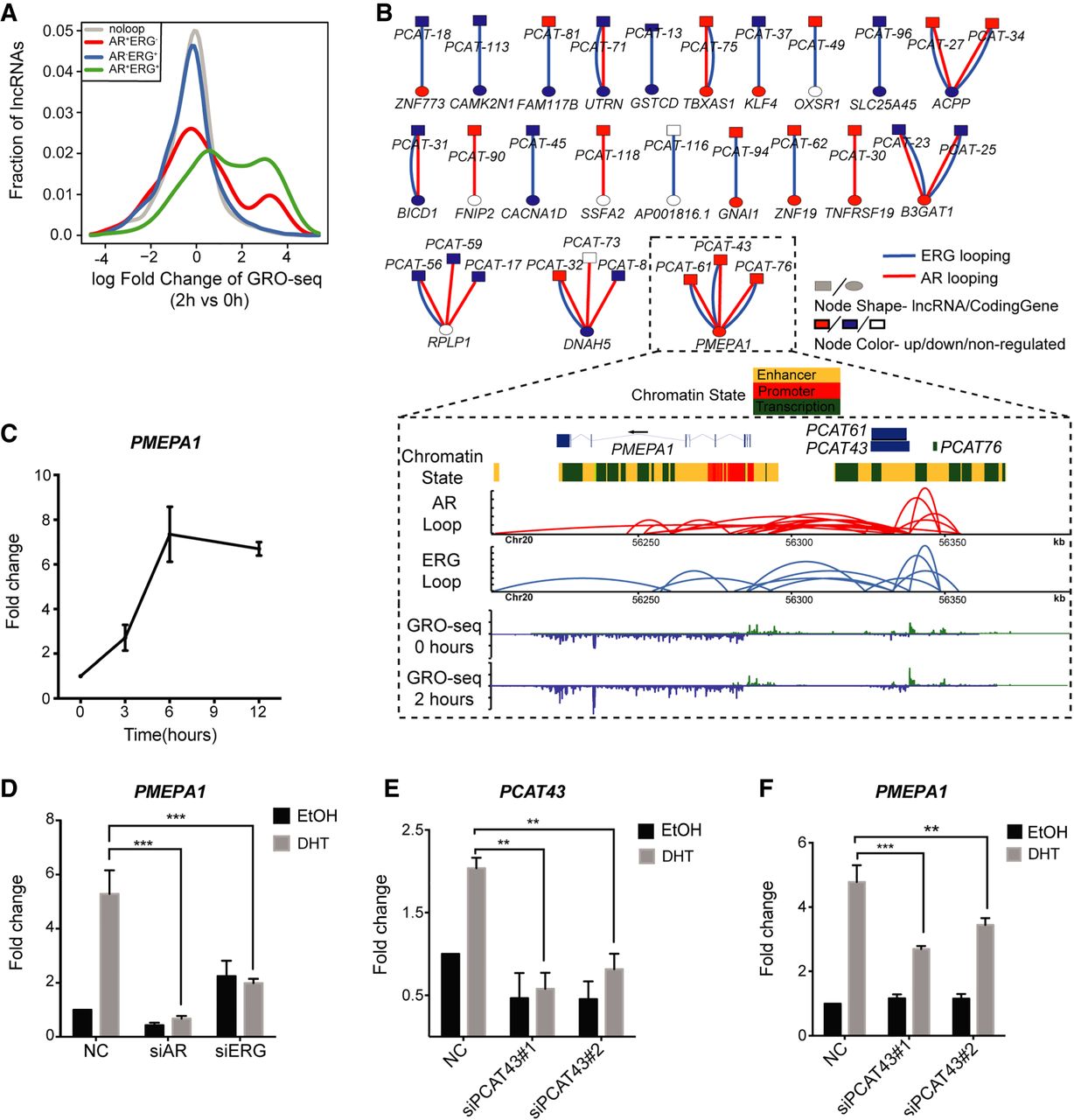Functional relationship between lncRNA and chromatin loops in the AR-ERG transcriptional network. (A) Distribution of lncRNA expression change from 0 to 2 h after DHT treatment as measured by GRO-seq. Genes were classified into four categories depending on their association with different loop types. The x-axis shows the log fold change of the lncRNA expression, and the y-axis is the fraction of genes in the given lncRNA categories. (B) Bipartite graph linking clinically relevant lncRNAs to coding genes by AR/ERG looping. The node shape indicates the molecule type (lncRNA or coding gene), and the node color represents a more than 1.5-fold expression increase (red) or decrease (blue) after DHT treatment. Lower panel: An example showing three clinically relevant lncRNAs linked to the gene PMEPA1 by AR-ERG co-associated looping. Snapshot representation of (from top to bottom) gene track and ChromHMM track, the ERG and AR loops (defined by ChIA-PET), and transcriptional rate profiles before and after DHT (defined by GRO-seq). (C) Graph showing the time-dependent activation of PMEAP1 in VCaP cells after treatment with 10 nM DHT. (D) Bar graph showing the expression of PMEAP1 in VCaP cells transfected with siNC, siAR, or siERG and treated with DHT or EtOH for 6 h. (E) Transcribed from the same genomic region, PCAT43 and PCAT76 transcripts are indistinguishable from each other. Bar graph showing the efficiency of siRNA-mediated knockdown of PCAT43 in VCaP cells. (F) Graph showing the effect of PCAT43 knockdown on the androgen regulation of PMEAP1. VCaP cells transfected with siPCAT43 were treated with DHT or EtOH for 6 h.