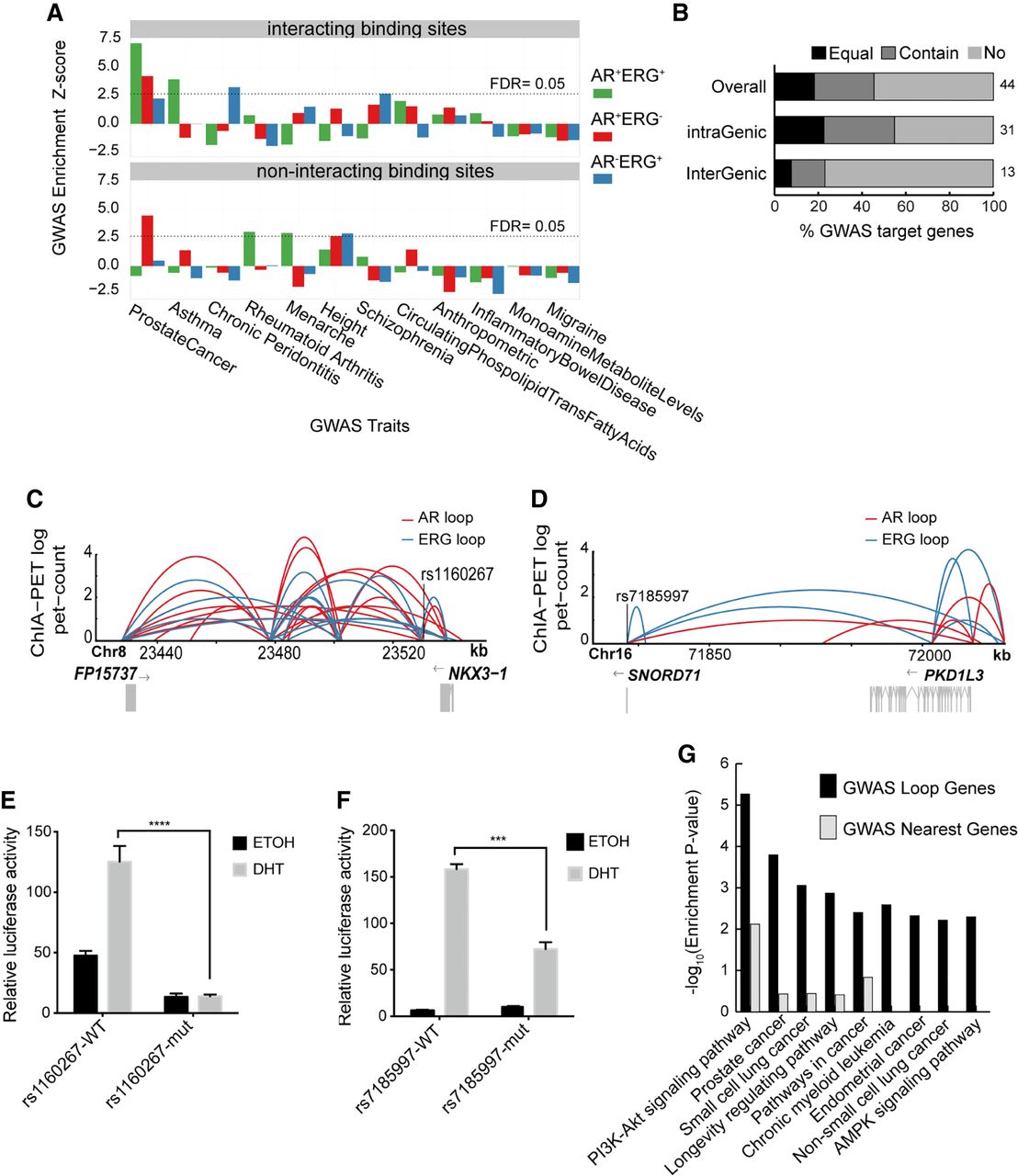 Noncoding GWAS SNPs contribute to the risk of prostate cancer through AR/ERG chromatin interaction. (A) Graph showing the enrichment of different classes of AR/ERG binding sites in diverse GWAS traits. Upper panel: Examined regions with AR/ERG chromatin looping including AR-ERG cobinding sites (green), AR only binding sites (red), and ERG only binding sites (blue) with overlapping GWAS top loci. Lower panel: Similar to the upper panel but considered only regions without AR/ERG chromatin looping. (B) The fraction of prostate cancer GWAS loci in either intra-genic regions or inter-genic regions whose targets genes (defined by AR/ERG looping) match the nearest gene: The nearest gene is the only target gene (Equal), the nearest gene is one of the target genes (Contain), and the nearest gene is not a target gene (No). (C) Prostate cancer associated GWAS SNP rs1160267 linked to the NKX3-1 gene through AR/ERG chromatin looping. (D) Prostate cancer associated GWAS SNP rs7185997 linked to PDK1L3 gene through AR/ERG chromatin looping. (E) Luciferase assay activity before and after mutating the GWAS SNP rs1160267, which is located in the enhancer region of the NKX3-1 gene. (F) Luciferase assay activity before and after mutating GWAS SNP rs7185997, which is located in the enhancer region of PDK1L3 gene. (G) A list of the top 10 pathways enriched in prostate GWAS target genes defined by either using our chromatin looping data or the nearest gene method.