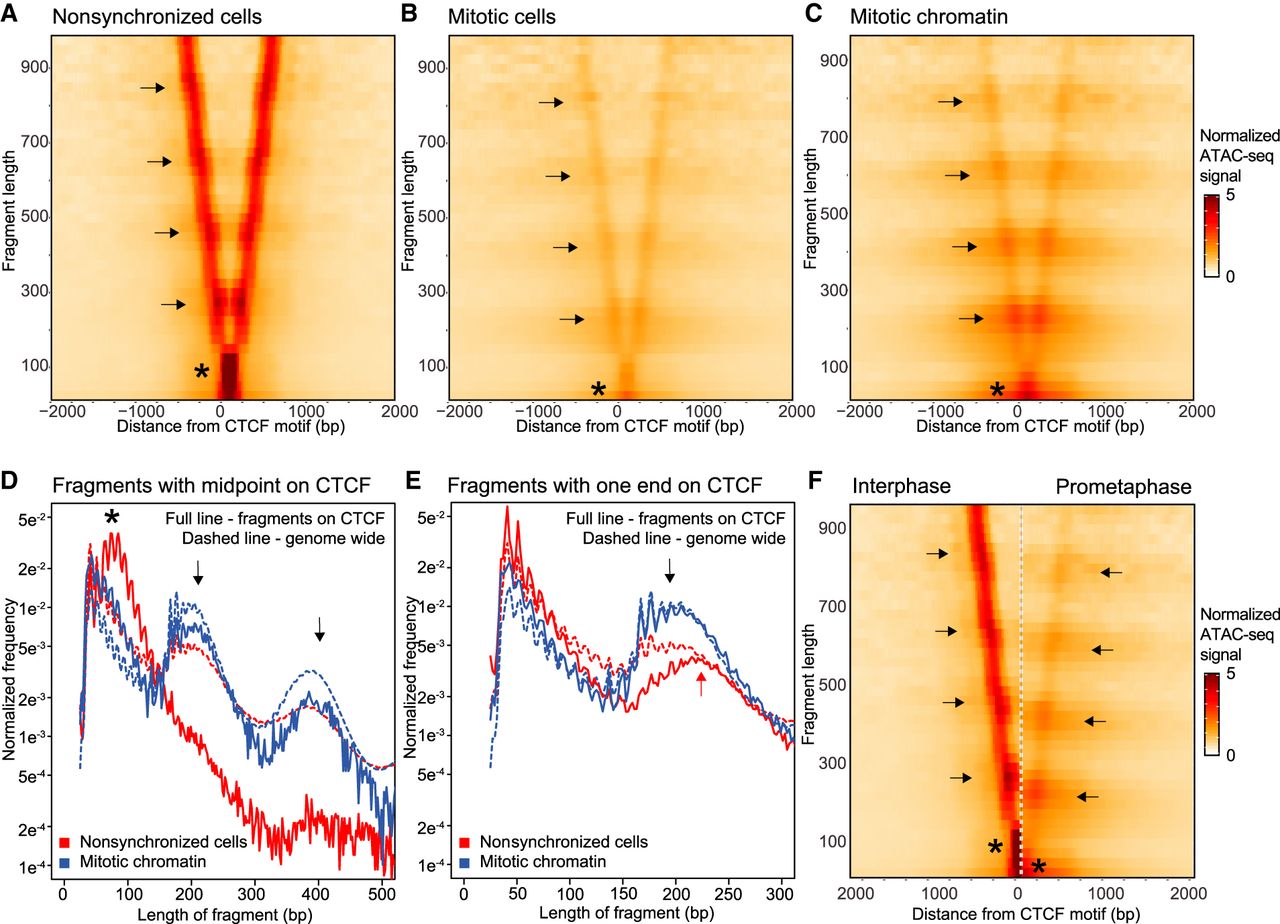 ATAC-seq data represented in V-plots show loss of CTCF binding in mitosis and rearrangement of nucleosomes flanking CTCF motifs. (A–C) ATAC-seq data represented in V-plots aggregated at CTCF sites. The lengths of ATAC-seg reads are plotted on the y-axis, and the distance between their midpoints and the CTCF motif is shown on the x-axis. (A) V-plot for interphase ATAC-seq data. Asterisk indicates the CTCF footprint. Enriched dots along the arms of the V (arrows) represent strongly positioned nucleosomes. (B,C): V-plots for ATAC-seq data from mitotic cells and purified mitotic chromatin aggregated at CTCF motifs with interphase ATAC-seq peaks. Asterisks mark the loss of the CTCF footprint. Arrows indicate positioning of flanking nucleosomes. (D) Distribution of fragment lengths of reads that have their midpoint on a CTCF motif: (dashed line) genome-wide average read length distribution; (arrows) read lengths representing one and two nucleosomes. (E) Distribution of fragment length of reads with either read end near a CTCF motif with interphase ATAC-seq peak compared to the genome-wide average (dashed line). In interphase, reads representing one flanking nucleosome are longer (red arrow) as compared to reads representing one flanking nucleosome in mitosis (black arrow). (F) Side-by-side comparison of V-plots for nonsynchronized and mitotic chromatin. The shift in nucleosome positioning is highlighted using arrows. Asterisks mark loss of CTCF footprint in mitosis.