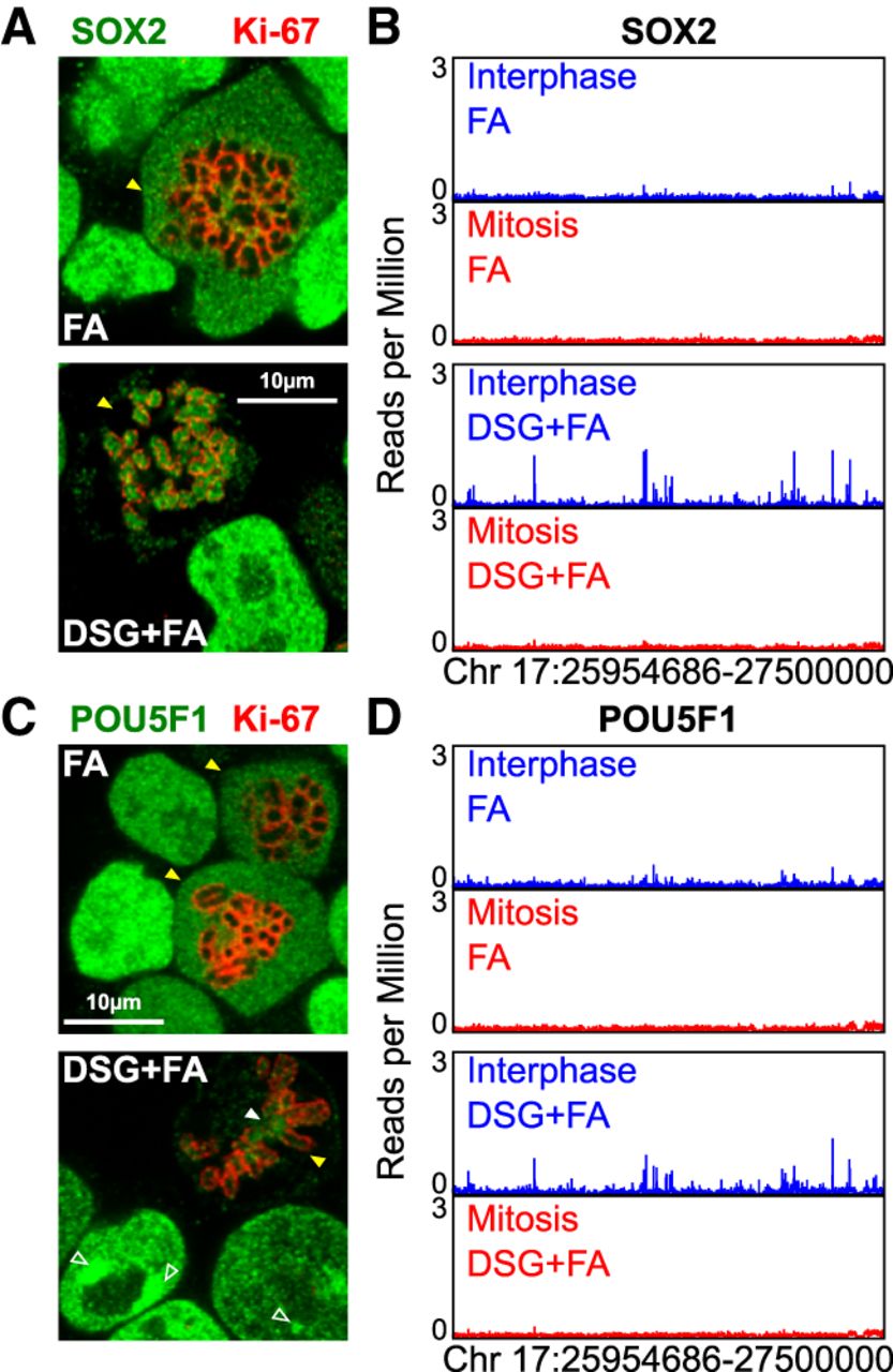 SOX2 and POU5F1 do not bind at regulatory regions in mitosis. (A) SOX2 immunofluorescence (green), after fixation with either FA (top) or DSG+FA (bottom). The mitotic chromosome periphery is identified by Ki-67 (red). (B) Representative binding profiles of SOX2 presented as in Figure 1D. (C,D) Results of the same analyses described in A and B are shown for POU5F1. Mitotic cells are indicated in A and C with yellow arrowheads. In C, the filled white arrowheads point to the centromeres, the empty white arrowheads to the PCH.