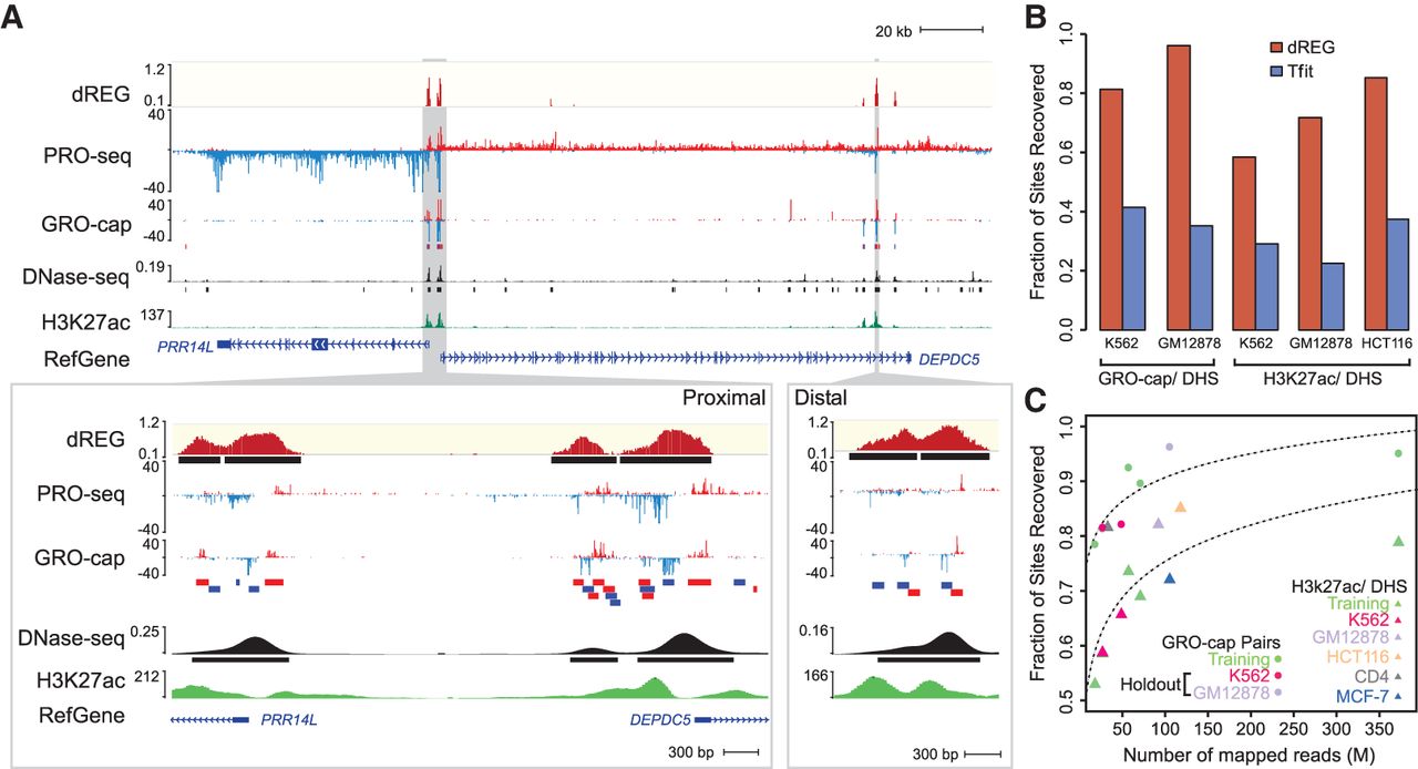 dREG identifies regions of transcription initiation. (A) WashU Epigenome Browser visualization of dREG signal, PRO-seq data, GRO-cap, DNase-seq, and H3K27ac ChIP-seq near the PRR14L and DEPDC5 genes. Inserts (cf. gray shaded pointers) show an expanded view of gene-proximal promoter elements (left) and a distal enhancer (right), each encoding multiple transcription initiation sites. (B) Bar plots show the fraction of transcribed DHSs (left) and H3K27ac+ DHSs (right) that were discovered by dREG (red) and Tfit (blue) in holdout data sets. (C) Scatterplot shows the fraction of sites recovered (y-axis) as a function of sequencing depth (x-axis) for 12 data sets shown in Supplemental Table S1. The best fit lines are shown. The color represents whether the data set was used for training (green) or is a holdout data set (K562, red) or cell type (GM12878, lavender; HCT116, orange; CD4+ T-cells, gray; MCF-7, blue).