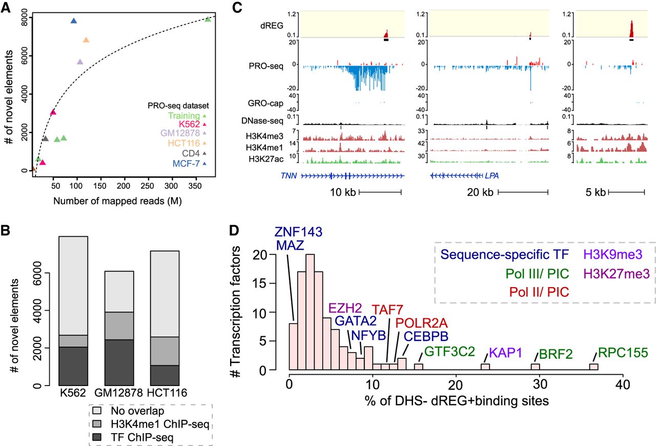 dREG identifies new regions that were not found using other molecular assays. (A) Scatterplot shows the number of new TIRs that were not discovered in DNase-seq or H3K27ac ChIP-seq data (y-axis) as a function of sequencing depth (x-axis) for seven data sets shown in Supplemental Table S1. The best fit line is shown. The color represents whether the data set was used for training (green) or is a holdout data set (K562, red) or cell type (GM12878, lavender; HCT116, orange; CD4+ T-cells, gray; MCF-7, blue). (B) Stacked bar charts show the number of elements discovered using dREG, but not found in DNase-seq or H3K27ac ChIP-seq (y-axis) for PRO-seq or GRO-seq data sets in K562, GM12878, and HCT116 cells. The color denotes other functional marks intersecting sites discovered only using dREG. (C) Three separate genome browser regions that denote TIRs discovered using dREG, but were not found in DNase-seq or H3K27ac ChIP-seq data. Tracks show dREG signal, PRO-seq data, GRO-cap, DNase-seq, H3K27ac ChIP-seq, and annotated genes. (D) Histogram representing the fraction of binding sites for 100 transcription factors supported by a dREG TIR that was not also discovered in DNase-seq data. Several of the outliers are shown. The color denotes whether the factor is a member of the RNA polymerase III (Pol III) preinitiation complex (green), Pol II preinitiation complex (red), associated with H3K9me3 (light purple), or H3K27me3 heterochromatin (purple), or is a sequence-specific transcription factor (blue).