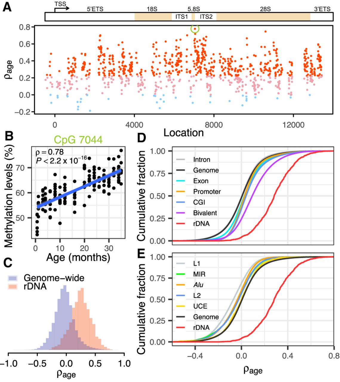 Ribosomal DNA methylation is strongly associated with age. (A) Age-associated hypermethylation of rDNA CpGs in mice. Spearman's correlation coefficients with age (ρage) for CpGs along the rDNA sequence. Red dots indicate CpGs with significant positive correlation with age (ρage > 0, FDR < 0.01); pink and light blue dots denote nonsignificant CpGs (FDR > 0.01) with positive and negative coefficients, respectively. The green circle indicates CpG 7044. (B) Scatterplot shows the correlation between CpG 7044 methylation and age (ρ = 0.78, P < 2.2 × 10−16). (C) The distribution of ρage for CpGs within the rDNA and across the whole genome (Wilcoxon rank-sum test, P < 2.2 × 10−16). (D,E) Cumulative distribution of correlation coefficients for various genomic elements. CpGs within CpG islands (CGIs) and bivalent chromatin have significantly higher ρage than the genome-wide background, although both of them are significantly lower than rDNA CpGs (P < 2.2 × 10−16). Repetitive elements, including L1, L2, Alu (B elements), and mammalian-wide interspersed repeats (MIR), tend to be hypomethylated during aging (P < 2.2 × 10−16) relative to the genome-wide background. All features on D, except for intron, show a shift to the right of the genome-wide background. All features on E, except for the rDNA, show a shift to the left of the genome-wide background. Also see Supplemental Figure S5.