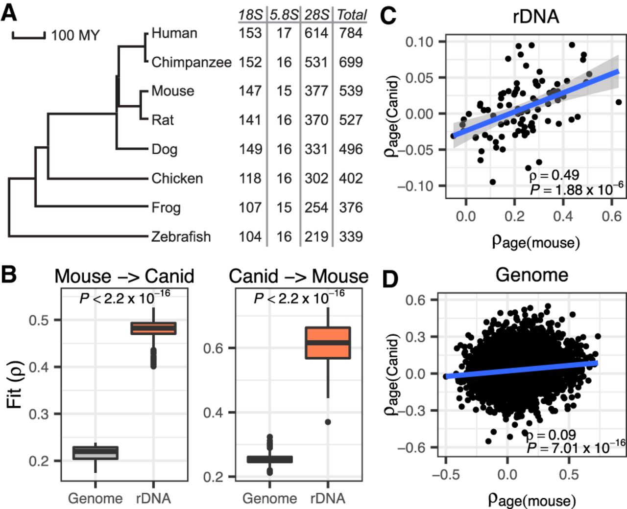 The ribosomal rDNAm clock is conserved between distantly related taxa. (A) Phylogenetic tree of seven vertebrate species with the number of homologous CpGs in each species (relative to human). (B) Interspecific mouse-canid clock models built using homologous CpGs in the rDNA yielded significantly better performance than those built using homologous genome-wide CpGs. Here, the model is trained in one species and applied to the other species. The fit is measured as the correlation coefficient (ρ) between rDNAm age and chronological age in the testing species. (C) Homologous CpGs from the rDNA show conserved age association (ρage) between mice and canids (ρ = 0.49, P = 1.88 × 10−6). (D) Homologous CpGs elsewhere in the genome show age association that is weakly correlated between mice and canid (ρ = 0.09, P = 7.01 × 10−16).