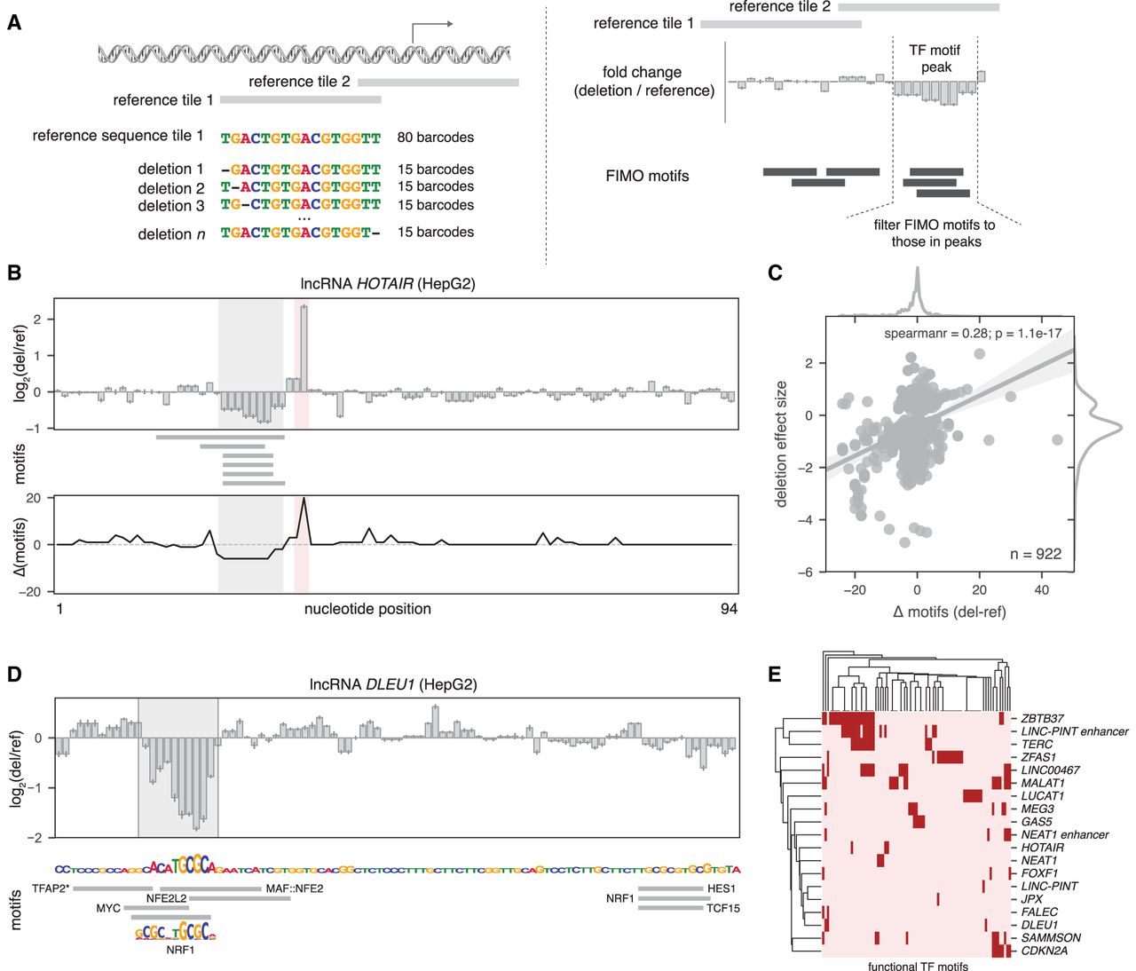 Targeted deletions refine TF motifs within lncRNA promoters. (A) Schematic of the single-nucleotide deletion MPRA design (left) and the output interpretation (right). (B) MPRA deletion profile for the lncRNA HOTAIR promoter (top), the positions of computationally mapped motifs in the reference sequence (middle), and the number of motifs predicted to be gained or lost due to the single-nucleotide deletions (bottom). Shaded areas represent the strongest gain (red) or loss (gray) of activity. (C) Correlation between the number of motifs predicted to be disrupted (x-axis) and the effect size of deletions (y-axis) for all significant deletions in HepG2. (D, top) MPRA deletion profile for the lncRNA DLEU1 promoter. Shaded area is a called peak. (Bottom) DLEU1 sequence (plotted with letter heights proportional to loss of activity in the MPRA) and computationally mapped motifs (gray boxes). The sequence logo for NRF1 is shown. (*) TFAP2A, TFAP2B, and TFAP2C all map to the noted gray box. (E) Heatmap showing all computationally mapped motifs that overlap deletion peaks in HepG2.