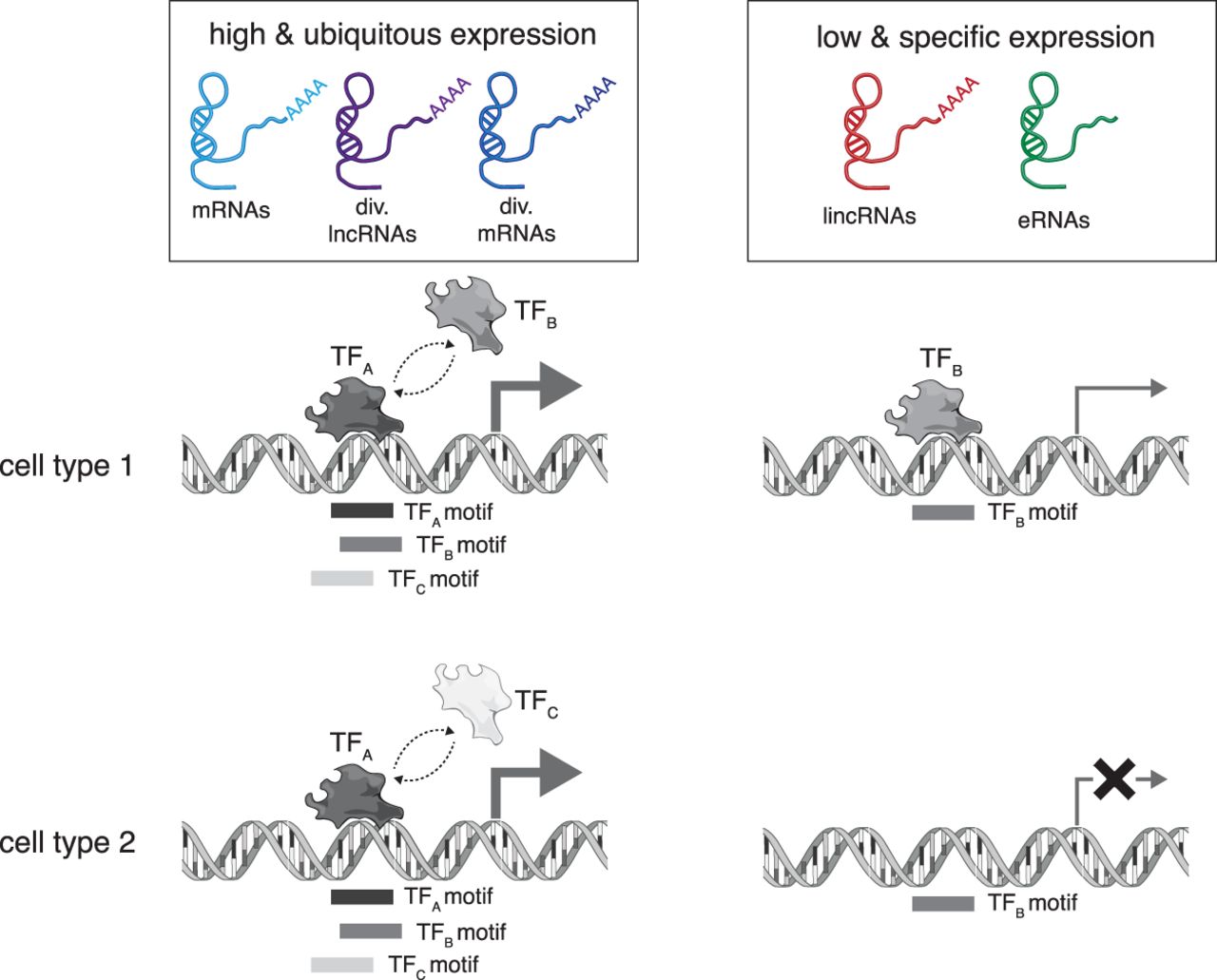 In this model, overlapping TF motifs are associated with high expression and low specificity. Schematic showing biotypes that are highly and ubiquitously expressed (left; thick arrow) have more overlapping TF binding sites (gray shaded boxes) and thus more TFs can bind both within a specific cell type or across cell types. Biotypes that are lowly and specifically expressed (right; thin arrow or crossed arrow) have fewer overlapping motifs and thus only a few TFs (one in the example) can bind. TFA is present in cell types 1 and 2, whereas TFB and TFC are only present in cell type 1 and cell type 2, respectively.