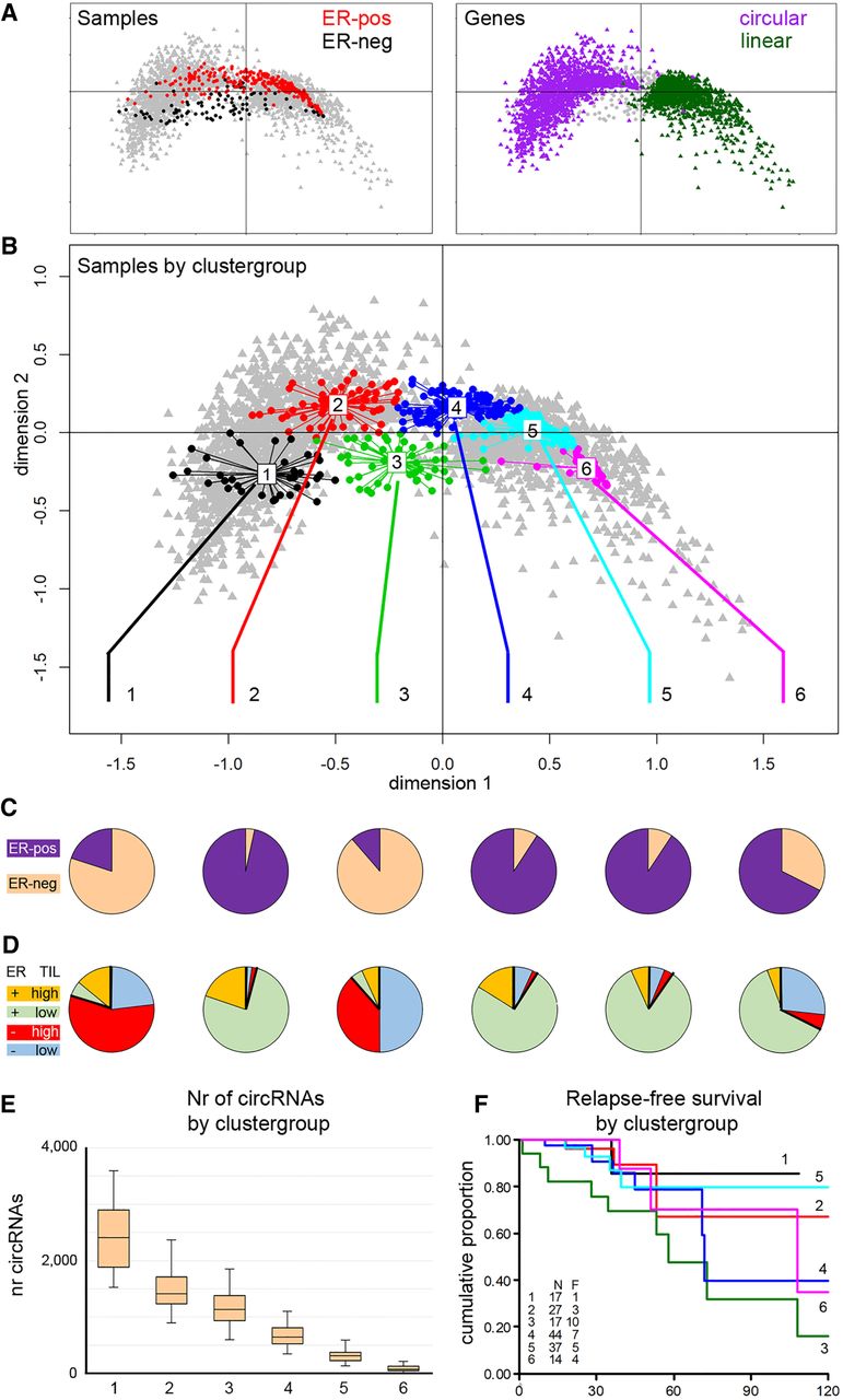 Analysis of sample groups according to circRNA presence. Multiple correspondence analysis (MCA) was used to find naturally occurring groups in the circRNA data. In an MCA plot, samples and circRNAs are projected onto the same plane, in which the relative distance to either the samples or the circRNAs is meaningful. The 0,0 point corresponds to a sample or circRNA with an average profile. (A, left) Samples are colored according to ER status: red, ER-positive; black, ER-negative. (Right) Purple and green indicate genes with or without circRNA expression, respectively. (B) Clustering identified samples with similar circRNA profiles; samples in the MCA plot are colored according to the cluster to which the sample belongs. (C) ER status (purple, ER-positive; peach, ER-negative) and (D) TIL status of the six sample groups: Red and orange are high-TIL cases and blue and green are low-TIL cases for ER-negative and ER-positive, respectively. (E) Number of circRNAs per sample group. (F) Relapse-free survival plot by sample group. (N) number of patients; (F) number of patients who relapse; (x-axis) months; (y-axis) the cumulative probability of relapse-free survival.