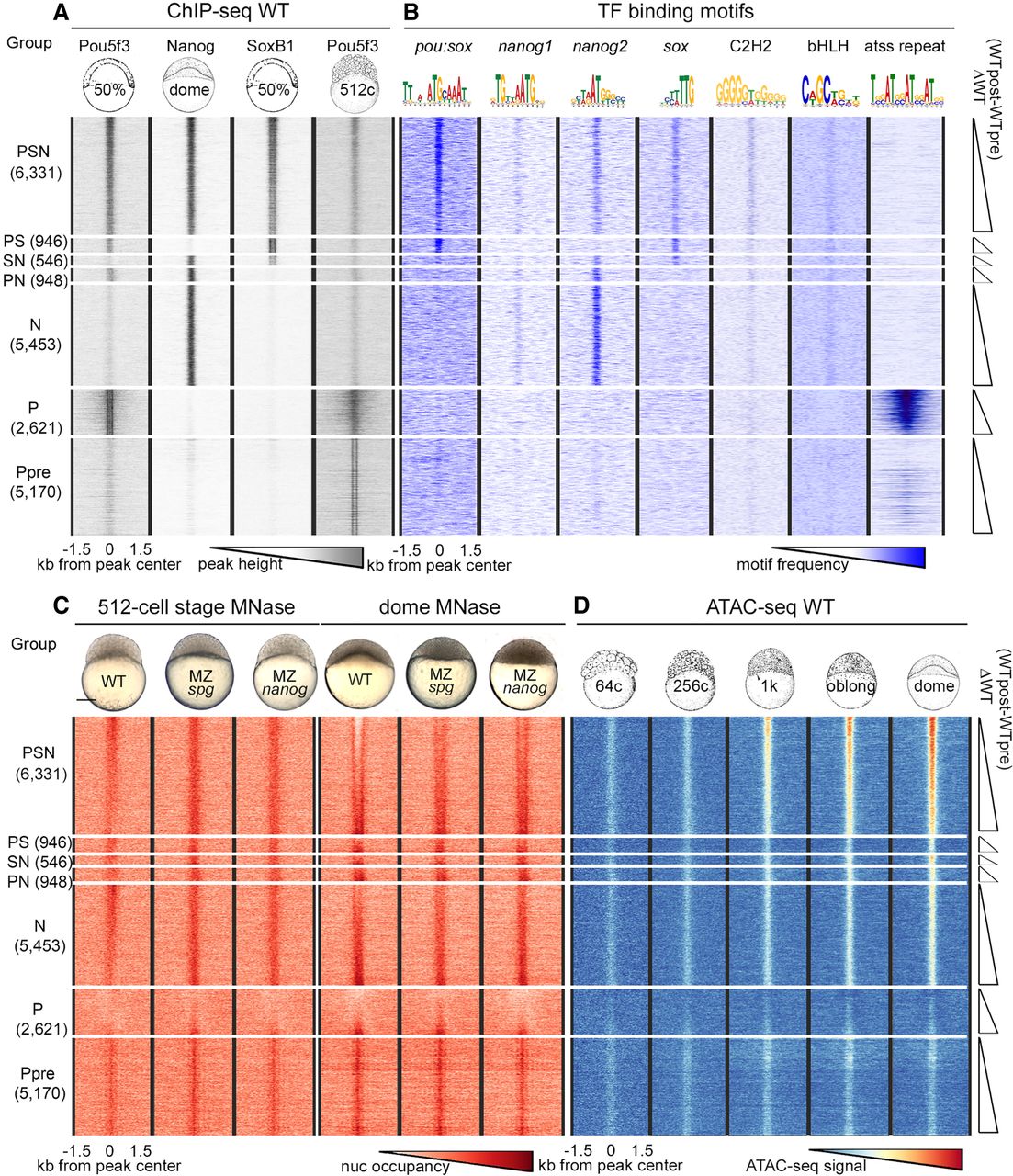 Nucleosomes cover all TFBSs pre-ZGA and are depleted from PSN triple-bound regions post-ZGA. Heat maps of six groups of genomic regions defined by combinatorial binding of Pou5f3, Nanog, and SoxB1 post-ZGA, as indicated at the left, and Ppre group bound by Pou5f3 only pre-ZGA. Three-kilobase genomic regions were aligned at the ChIP-seq peak centers. Within each group, the data were sorted by ascending difference between wild-type (WT) post-ZGA and pre-ZGA nucleosome occupancy (ΔWT post-pre). (A) TF binding (Pou5f3 50% epiboly, Nanog and SoxB1 dome stage, Pou5f3 512-cell stage). (B) Occurrence of TF binding motifs. (C) Nucleosome occupancy in the embryos of indicated genotypes. (D) Accessible chromatin signals in pre-ZGA (64c, 256c; c indicates cell stage), ZGA (1K), and post-ZGA stages (oblong, dome). (C) Scale bar, 200 µm.