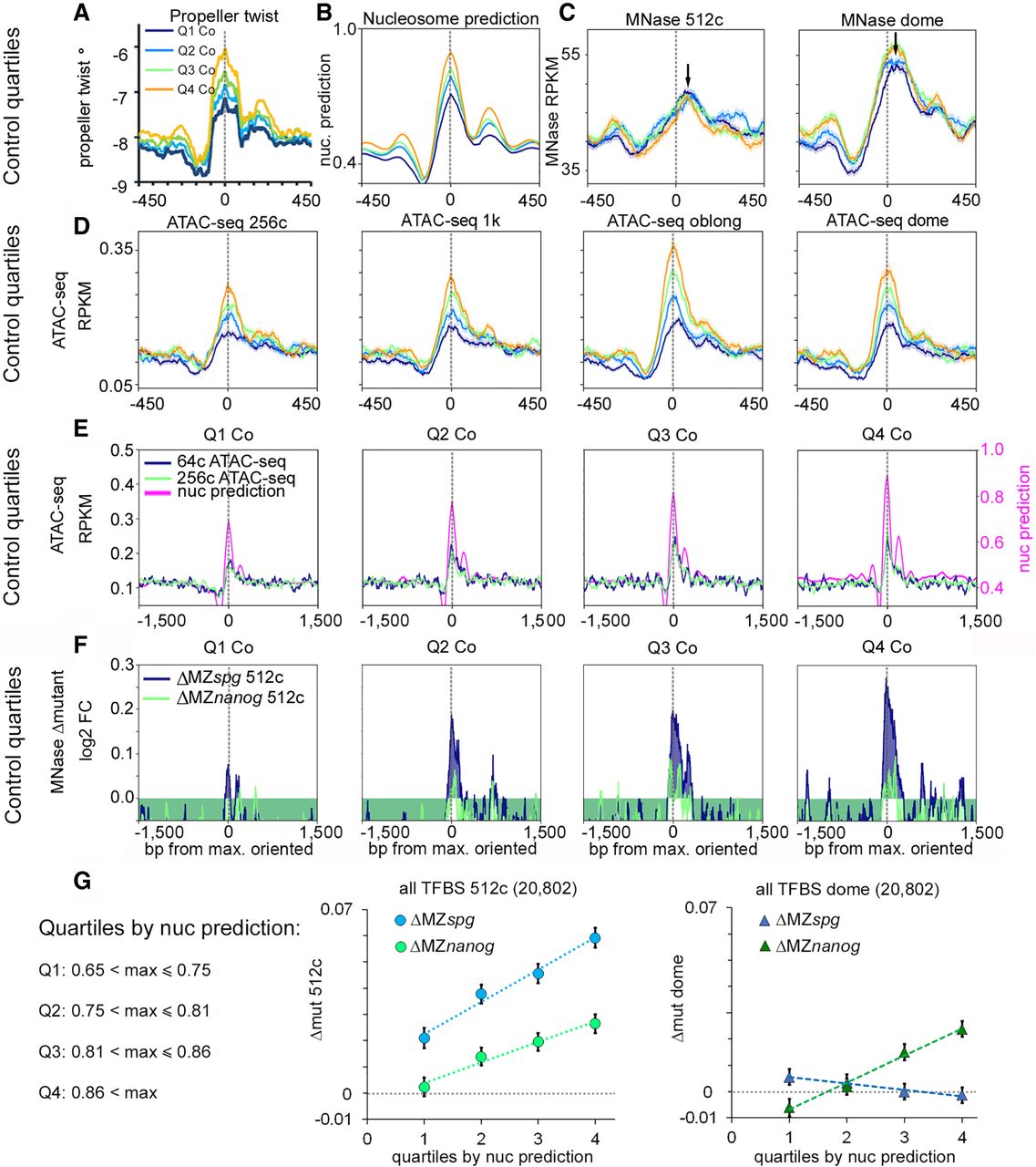 Pou5f3 and Nanog randomly displace nucleosomes from HNAR centers pre-ZGA. (A–D) Random control genomic regions were ranked by ascending nucleosome prediction score into quartiles Q1 through Q4, aligned at HNAR centers ([nucmax]; gray dotted lines), and oriented as in Figure 3H. (A) Propeller twist (PT°); (B) nucleosome prediction; (C) MNase-seq (black arrows show the lateral shift from [nucmax]); and (D,E) ATAC-seq signal colocalizes with [nucmax] and increases with nucleosome prediction value. (F) Random control quartiles: Nucleosome displacement from HNAR centers by Pou5f3 and Nanog at the 512-cell stage increases with nucleosome prediction value. Gray dotted lines indicate [nucmax]. (G) Dependencies of Δmut (nucleosome occupancy) from nucleosome prediction strength in the whole TFBS data set: (left) 512-cell stage; (right) dome.