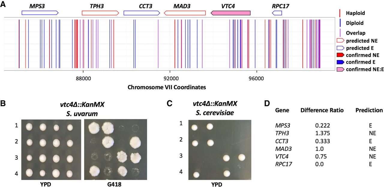 Validation of the S. cerevisiae–specific essential gene VTC4. (A) Mapped chromosomal insertion positions are plotted across Chromosome XII. Haploid inserts are indicated in red; diploid inserts, in blue; and overlapping inserts, in purple. Genes indicated across the top are outlined according to predicted dispensability and filled in if confirmed. Light pink filling indicates a gene that is essential in S. cerevisiae and nonessential in S. uvarum (confirmed NE_E). (B) Tetrad analysis of a heterozygous vtc4Δ strain displaying viable segregants with the vtc4Δ allele in S. uvarum plated on YPD and G418. (C) Tetrad analysis of a heterozygous vtc4Δ allele in S. cerevisiae resulting in inviable segregants. (D) Table indicating the insertion ratio (number of haploid inserts by the number of diploid inserts) per gene. The final column lists the predicted classification: (NE) nonessential; (E) essential; (N/A) no data.