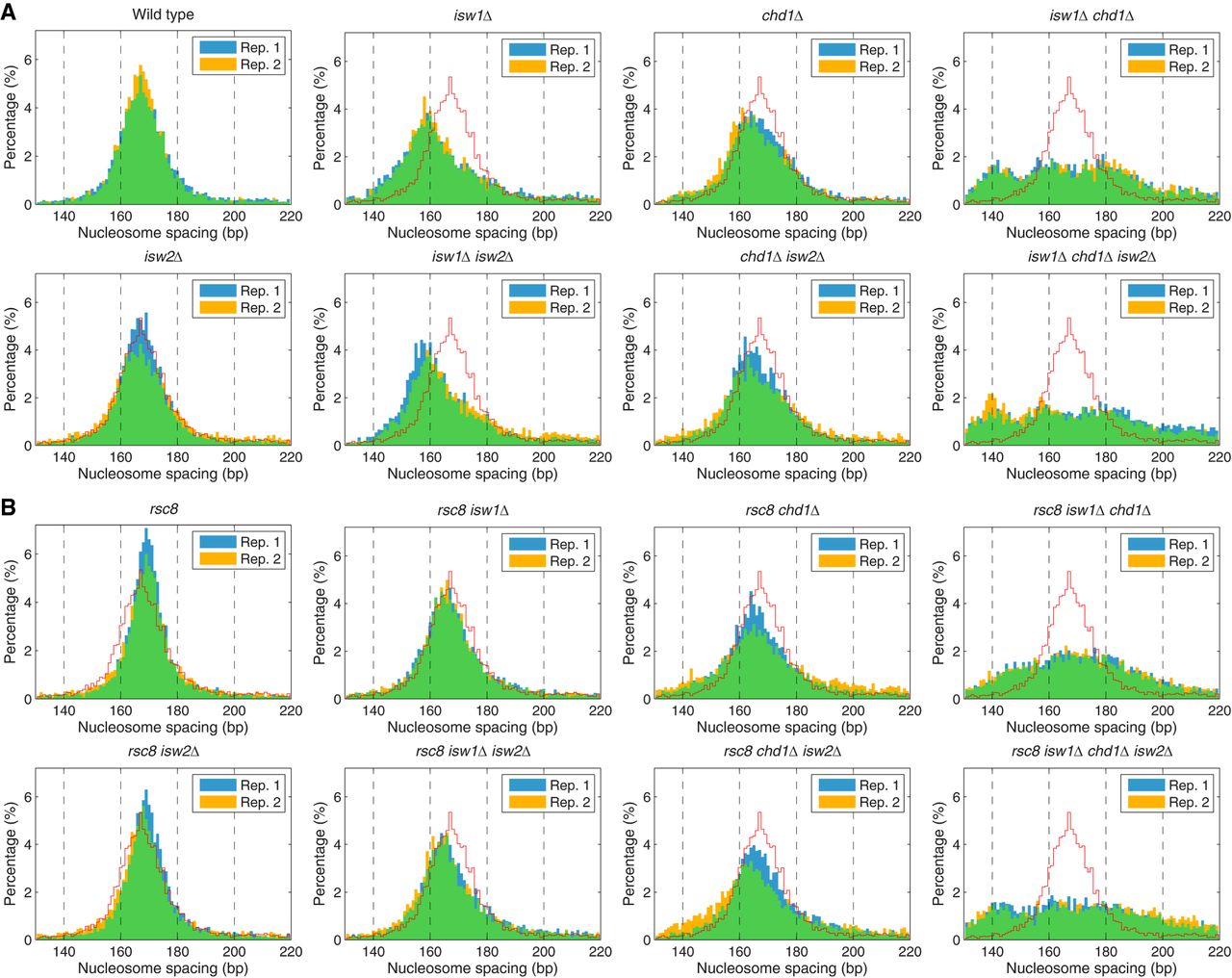 Nucleosome spacing distributions in the chromatin remodeler mutants. Histograms of the percentage of genes having a given average spacing (1-bp bins). Data from two biological replicates are shown, indicated by blue and yellow bars; overlap is indicated by green bars. For comparison, the wild-type histogram is indicated by the red line. (A) Spacing distributions in wild type, isw1Δ, chd1Δ, and isw2Δ mutants (from Ocampo et al. 2016). (B) Spacing distributions in rsc8 mutants.